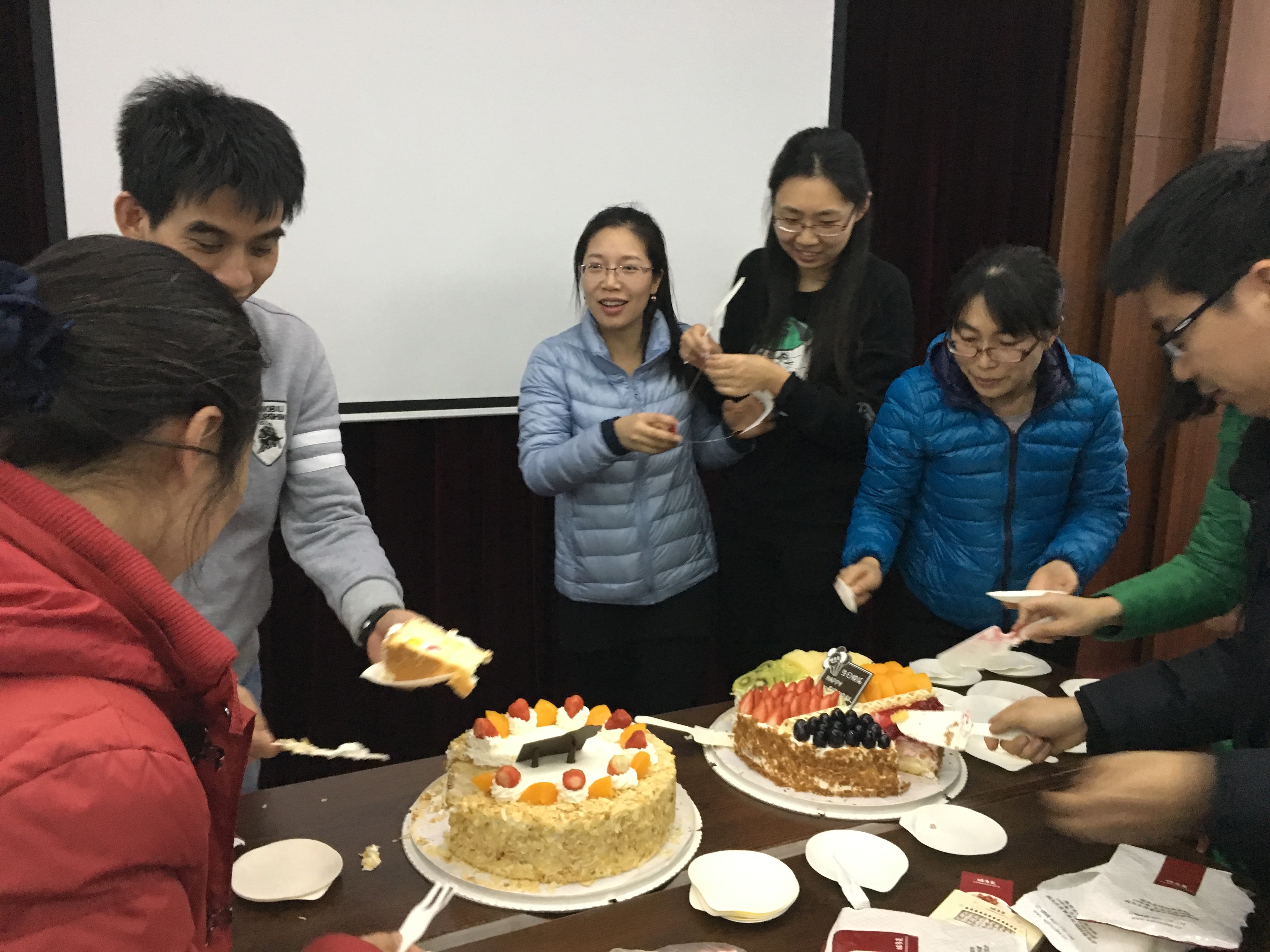这是本学期最后一次为老师集体过生日,化学学院党政领导班子成员、工会委员以及全院老师都向过生日的老师祝贺。在生日歌的祝福下,大家开心地切开蛋糕、吃水果,共祝生日快乐,并合影留念。