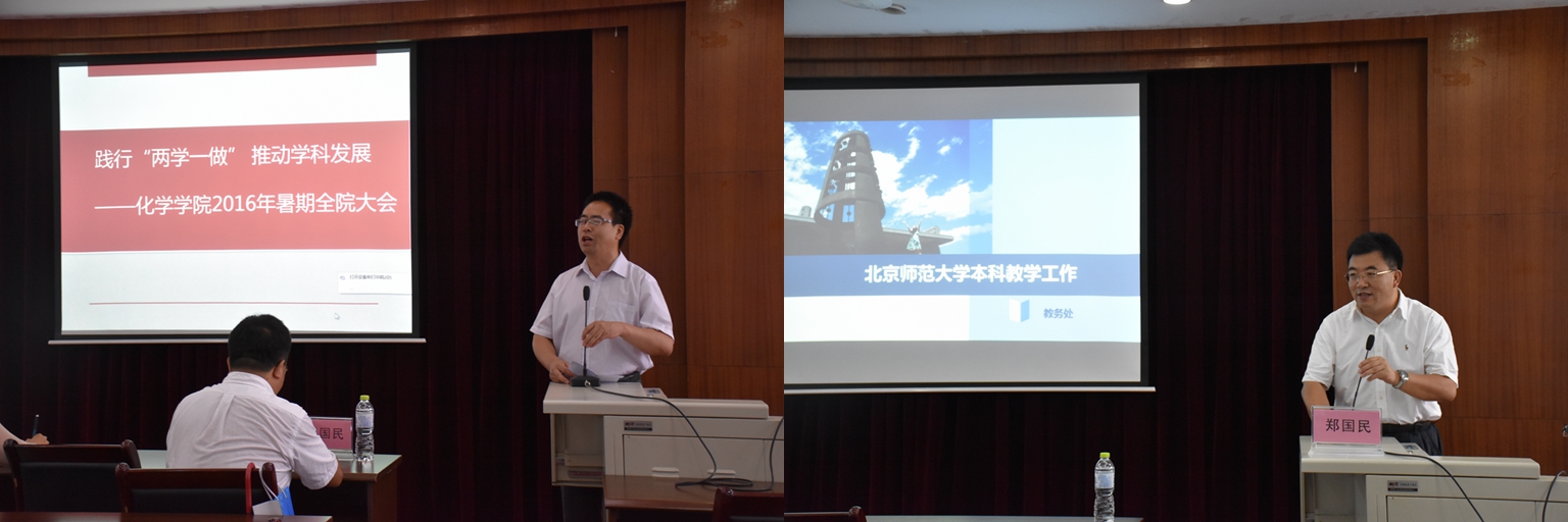 2016年7月15日上午,化学学院分党委、院行政和院工会共同组织了践行“两学一做”,推动学科发展的教师暑期教育实践活动。活动邀请了教务处处长郑国民教授、历史学院分党委书记耿向东教授和科技处副处长王准老师做了专题讲座。