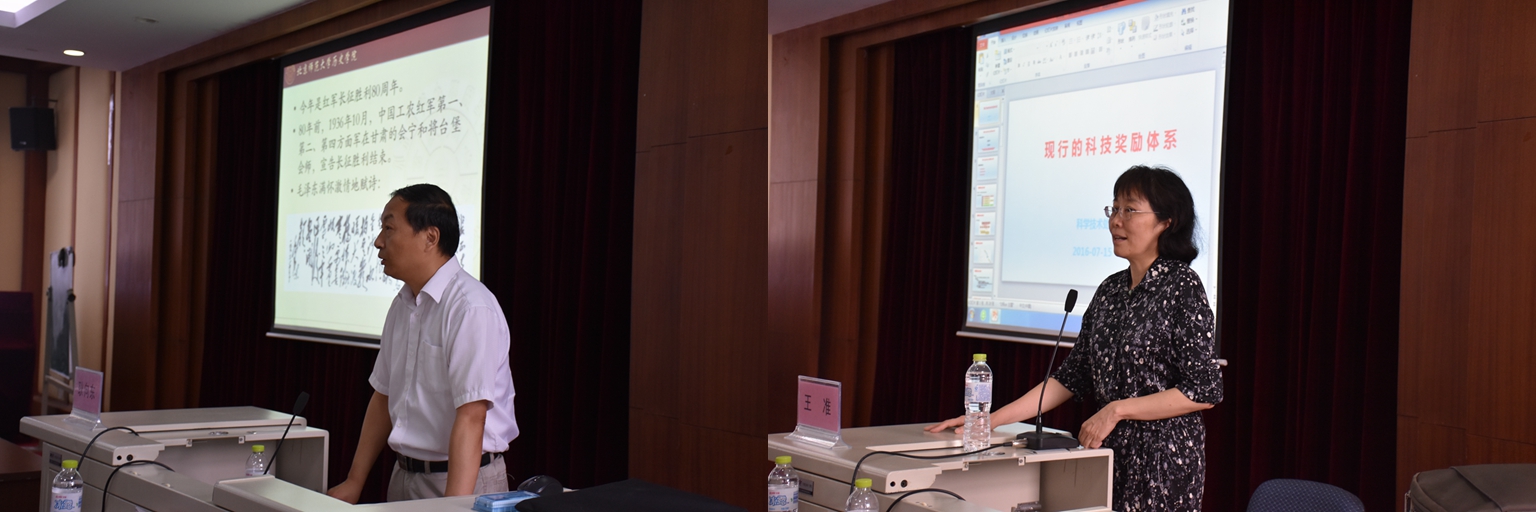 教育处处长郑国民教授做了题为“对本科教育该科的思考”的报告,详细地分析了化学学院学科评估中的本科教学情况,从本科生培养方案的三制三化和优质通识教育课程的建立等方面为化学院的教学改革提出了合理的指导和建议。历史学院耿向东教授给化学院全体教师带来了“红军长征及其当代价值”的精彩演讲,从长征的历史背景、长征的过程和长征胜利三个方面详细介绍了红军长征的历史意义和当代价值。科技处副处长王准老师就现行的科技奖励体系情况,详细介绍了国家级、省部级科学技术奖的申请、评审和颁奖过程,并且热情地鼓励化学院教师积极申请各级科学技术奖项。