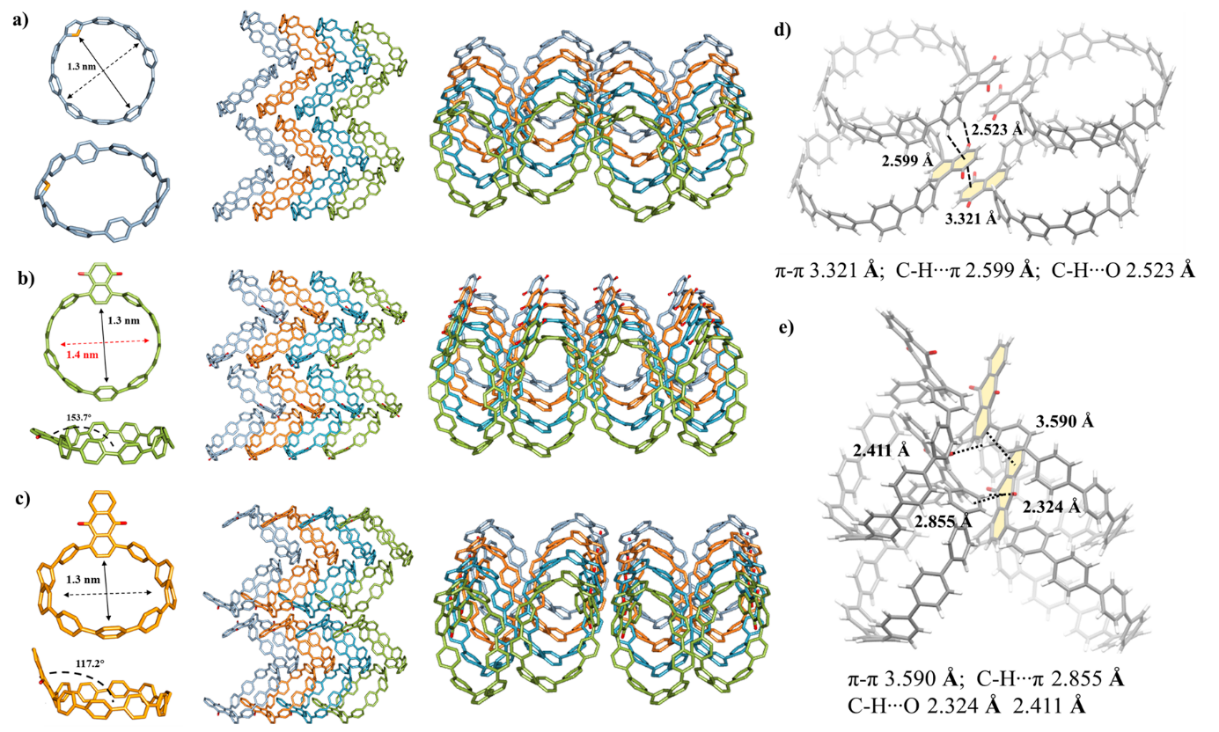 图2. Th[10]CPP、Nq[10]CPP与Aq[10]CPP的单晶结构,堆积图,以及分子间相互作用图。