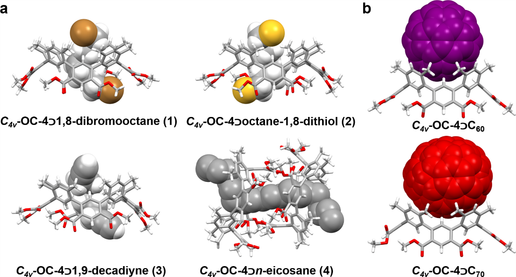 C4v-OC-4具有更加开放的空腔结构,其可作为新型分子受体,与富勒烯 C60 或 C70形成 1:1 主客体复合物;或与直链烷烃衍生物形成准轮烷结构,在富勒烯分离及互锁结构构筑等领域具有潜在的应用前景,而C2v-OC-4则不具备相关性质。