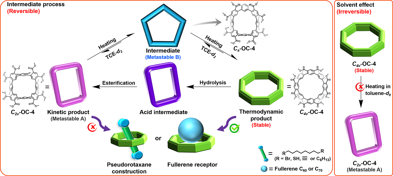 近日,龚汉元老师课题组通过片段偶联策略合成了环[4](1,3-(4,6)-二甲基苯)[4](4,6-(1,3)-间苯二甲酸甲酯) (OC-4)。在乙腈中,333 K下进行环合反应时,可获得室温下稳定的C2v和C4v对称性的两种大环阻转异构体,即C2v-OC-4和C4v-OC-4。而在甲苯中,373 K下进行环合反应时,可选择性获得C4v-OC-4。通过系列对比实验及理论计算可知C2v-OC-4和C4v-OC-4分别为动力学和热力学产物,该结论进一步通过在高温 (573 K) 下C2v-OC-4向 C4v-OC-4的定量转化得到证实。