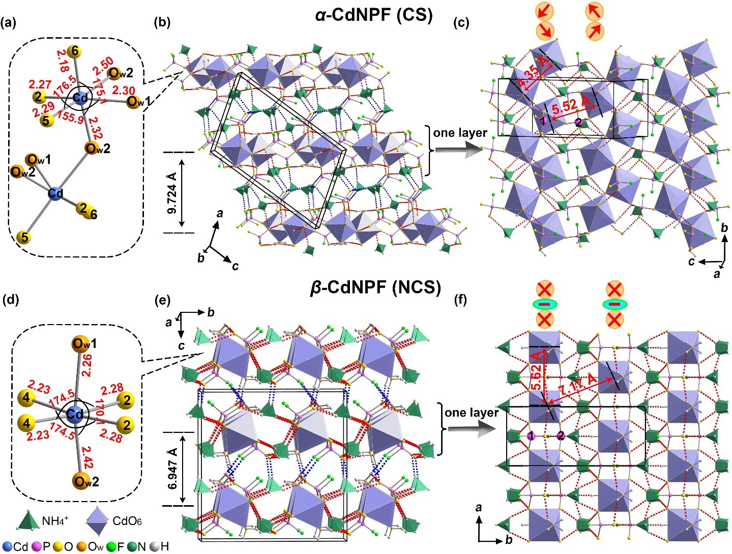 在本研究工作中,北京师范大学化学学院吴立明教授和陈玲教授团队发现了罕见的溶液浓度驱动的异构化结晶现象。他们发现深紫外区透明的α相和β相Cd(NH4)2(PO3F)2·2H2O(CdNPF)新化合物为同质异构体,其晶体结构分别是中心对称的单斜P21/nα-CdNPF相和非中心对称的正交Cmc21β-CdNPF相。为探究浓度是如何驱动同质异构的机制,他们将1:2的化学计量比的CdI2和(NH4)2PO3F配成浓度分别为0.15 mol/L (M) 和0.20 M(以CdI2计)的溶液,然后利用等量的丙酮进行扩散法生长单晶体。紫外可见吸收光谱证实了在高CdI2浓度溶液中,Cd2+与更多的[PO3F]2-配位,并以反式-[Cd(H2O)2(PO3F)4]多面体形式结晶于β-CdNPF相;而低CdI2浓度溶液中,则以面式-[Cd(H2O)3(PO3F)3]多面体形式结晶于α-CdNPF相。由于β相中反式构筑单元偶极矩小,(1.06 D vs. 1.60 D),成功消除了[CdO6]八面体构筑单元之间强烈的反平行偶极-偶极相互作用,实现了从中心对称α相到非中心对称的β相的异构化转变。此外他们还发现:从α相到β相,正是由于[CdO6]八面体的[PO3F]2-配体数从3增加到4的微小差异,不仅使得发生在费米能级附近的Cd2+4d10 → 4d95s1荧光产生轻微红移(β相: 437 vs. α相: 431 nm),而且使得能隙减小( β相: 4.01 eV vs. α相: 4.05 eV)。结合理论研究,他们揭示:由于[PO3F]2-的配体场强度弱于H2O分子,β相中Cd2+的5s轨道能级较低,因此造成荧光红移,能隙减小。β相CdNPF是首例非中心对称的单氟磷酸镉盐,具有较强的倍频强度0.78 × KDP@1064 nm,吸收截止边λcutoff < 200 nm,激光损伤阈值高达1.48 × KDP,有望成为潜在的深紫外非线性光学晶体材料。该研究所揭示得溶液浓度驱动的异构化结晶机制,为更多非线性光学晶体的设计和探索提供了一种非常规的新颖思路。