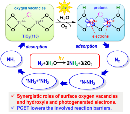 半导体材料的光催化固氮是最前沿的研究热点之一。氨气是地球氮循环过程中氮气向蛋白质和肥料转变的重要中间体。哈伯-博施固氮方法的反应条件严苛,需高温高压,能源消耗巨大,且污染环境。因此利用太阳能光催化技术来固氮生成氨气被国内外一些科学家认为是化学界的“圣杯”反应之一。光催化过程能在温和条件下将N2还原为NH3,为更安全、清洁、可持续的NH3生产提供了一条无碳化道路。早在1977年Schrauzer和Guth已证实在TiO2上N2可以发生光还原。随后也有科学家进行了一系列相关的研究,但对TiO2表面光固氮现象的认识一直得不到统一。2017年日本研究小组报道了富含氧空位的二氧化钛在紫外光照射下可以在温和条件下光催化N2还原生成氨,为TiO2光催化固氮提供了实验证据,但具体的微观机理尚不清楚。
