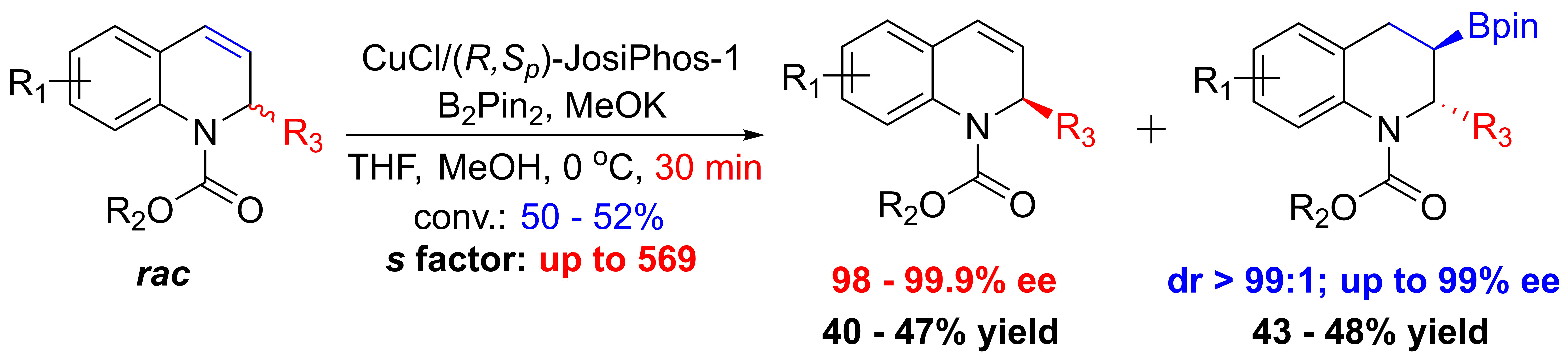 动力学拆分是获得手性化合物的一种重要方法,在不对称催化合成中受到广泛关注,也成为有机化学的热点研究领域之一。侯国华课题组首次将不对称催化硼氢化反应应用于动力学拆分。使用CuCl/JosiPhos作为催化剂,高效、高选择性地实现了2-取代-1,2-二氢喹啉的不对称硼氢化动力学拆分反应。该方法不仅能够以98 – 99.9% ee的高光学纯度获得回收的2-取代-1,2-二氢喹啉底物,同时还能够以优异的非对映选择性(dr > 99:1)和高达99% ee的对映选择性合成2,3-二取代-1,2,3,4-四氢喹啉的双手性硼氢化产物,动力学拆分选择因子s高达569。作者还对两种产物进行了官能团转化研究,并成功将回收的手性原料应用于选择性雌激素受体调节剂的不对称合成。此外,对该不对称硼氢化动力学拆分反应的机理作者进行了研究,并提出了合理的机理假设。该研究成果发表在 Chemical Science上(Chem. Sci. 2017, DOI: 10.1039/C7SC01556A)。