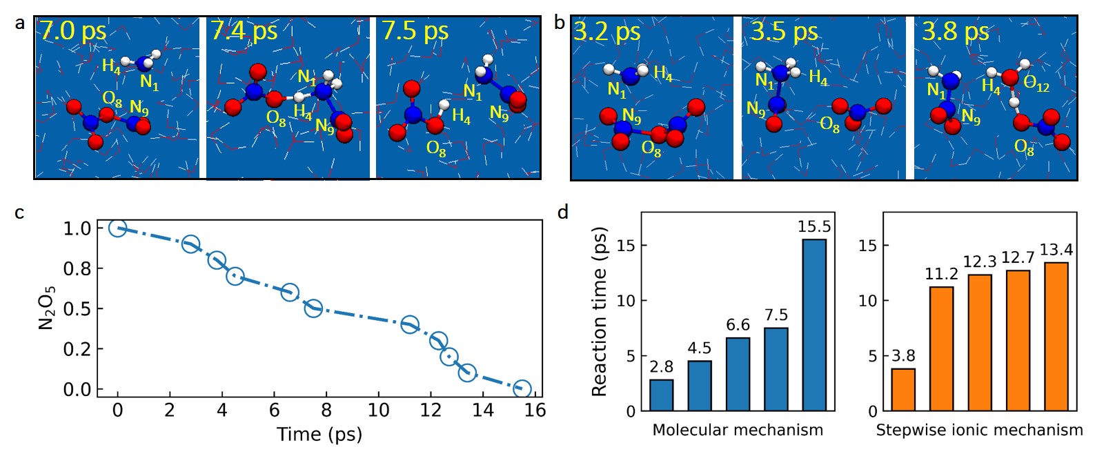 图2. N2O5在气-液界面通过(a)分子机制和(b)分步离子机制氨解的动力学快照。(c)根据气-液界面10次分子动力学模拟统计的未反应的N2O5比例。(d) N2O5通过分子和分步离子机制氨解的时间对比。