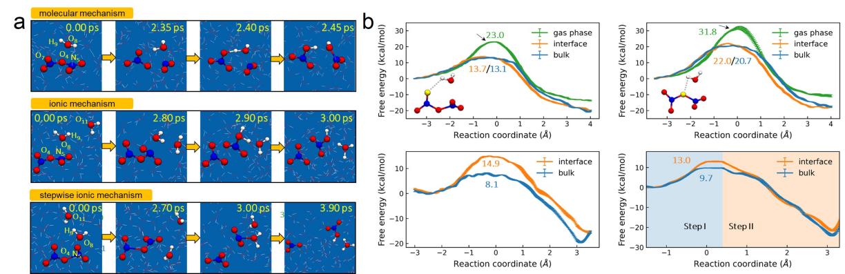 图1. a) N2O5在气-液界面和体相水中的不同水解机制,动力学快照分别表示(上)分子机制、(中)离子机制和(下)分步离子机制。b)气相、气-液界面和体相水中N2O5通过不同机制水解的自由能图。
