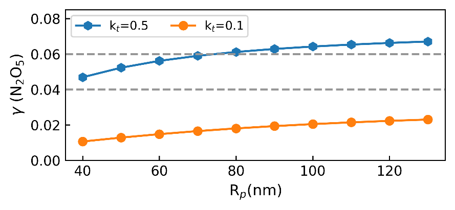 图3. N2O5在纯水中摄取系数随气溶胶粒径尺寸(Rp)的变化,灰色虚线标识了实验上测量的摄取系数范围。