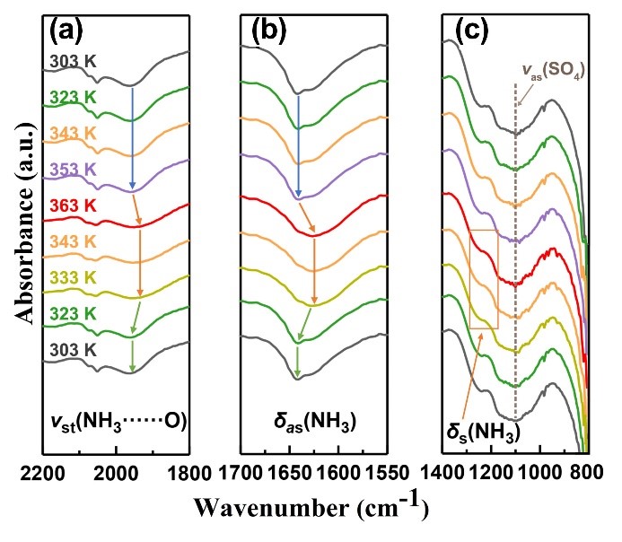 图2. 原位红外振动峰随温度升高,向低波数移动,说明伴随相变,氢键发生弱化;橙色方框:363 K到333 K变平滑的δs(NH3)振动峰说明高温下,阳离子基团高度无序。虚线:νas(SO4) (~1107 cm-1)位置保持不变说明SO42-在相变过程中只是发生空间上的无序,但S–O键长没有发生变化。