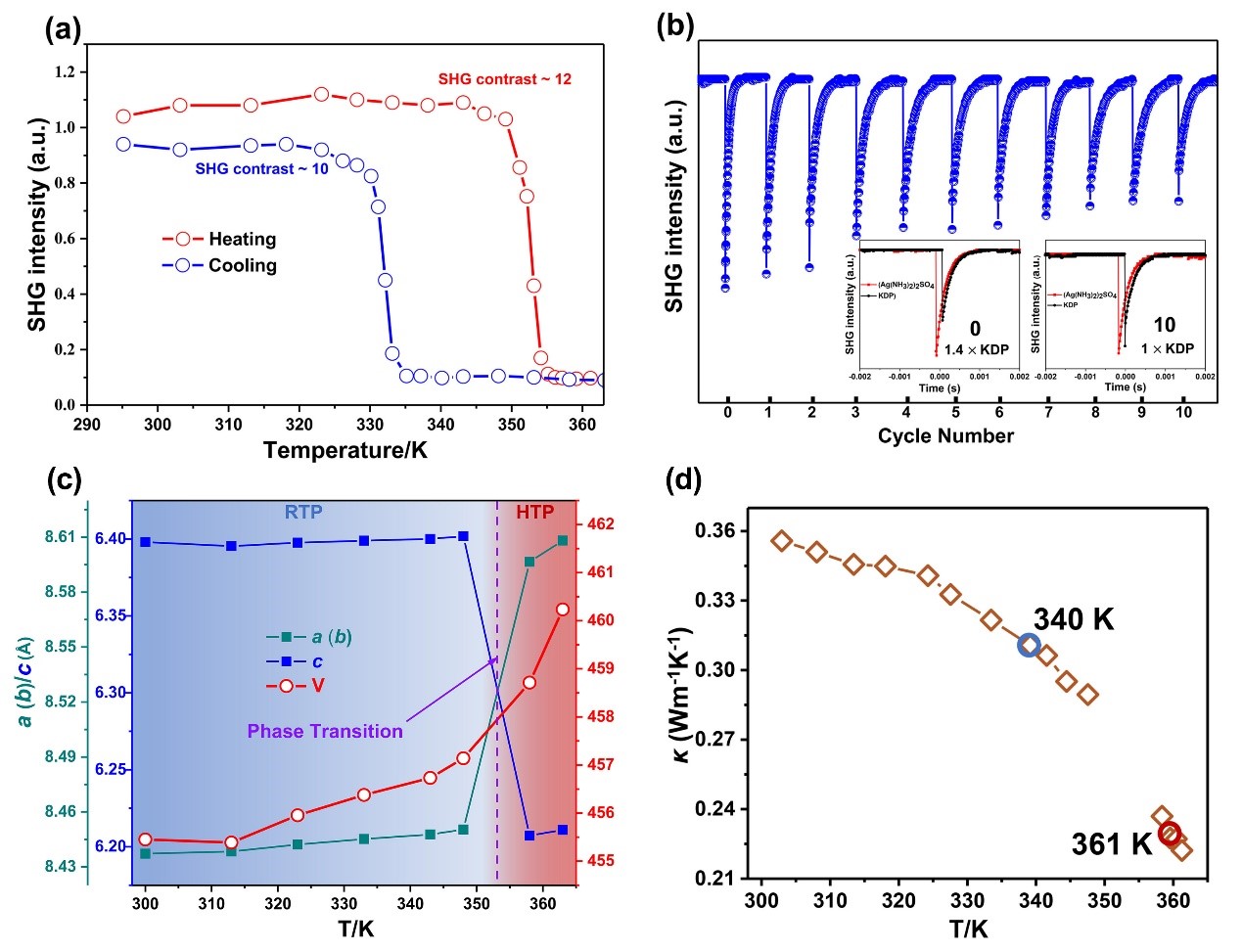 图3. [Ag(NH3)2]2SO4的SHG性能开关行为(a)。在10次循环下SHG开/关强度对比(b),插图:[Ag(NH3)2]2SO4的初始和第10轮循环后的SHG强度与KDP对比。[Ag(NH3)2]2SO4晶胞参数随温度变化(c),热导率随温度变化(d)。