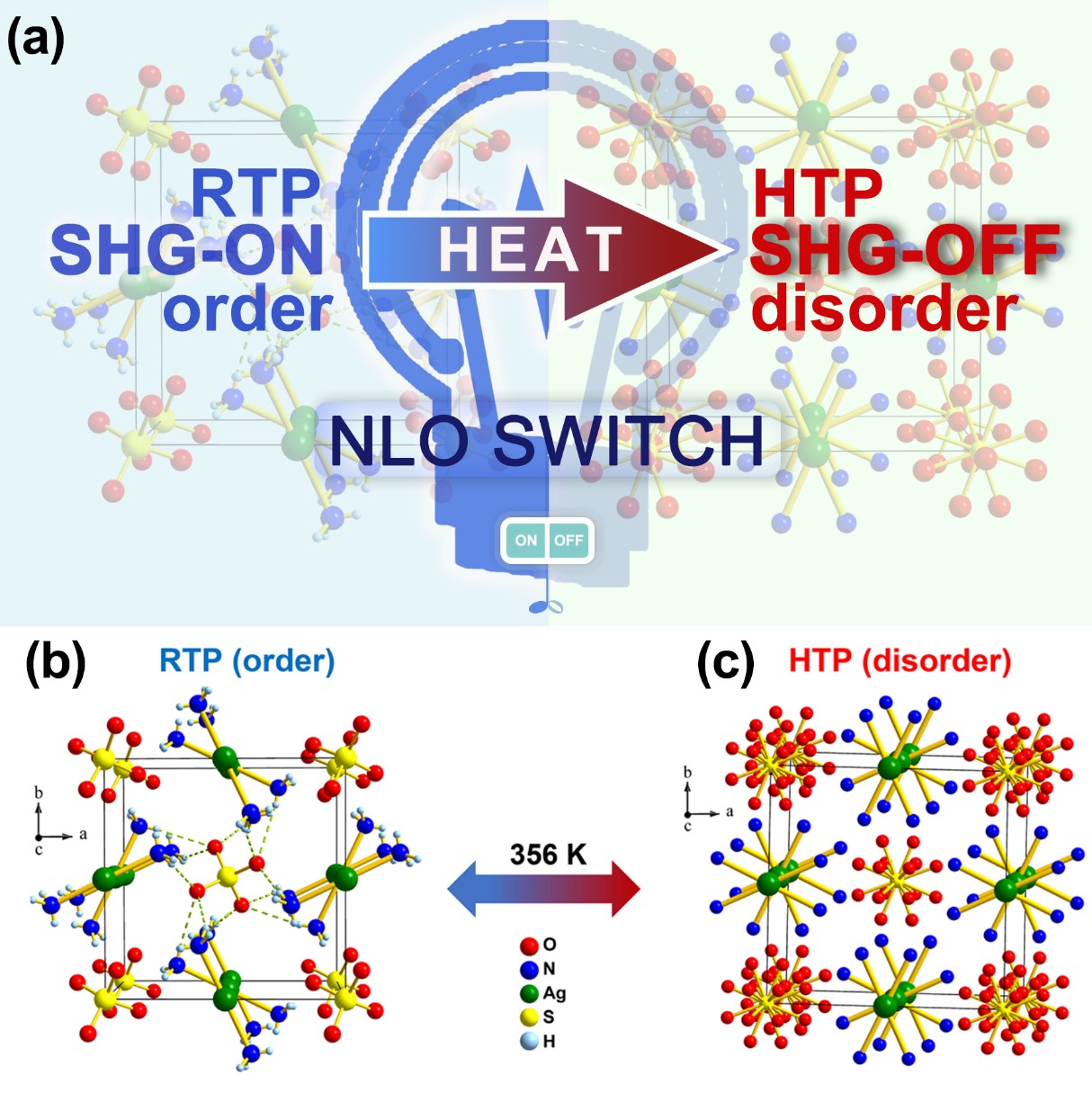 图1. 热刺激下氢键驱动有序-无序相变的近室温非线性光学开关材料[Ag(NH3)2]2SO4。(a)室温相(RTP)结构有序处于SHG-开状态(b)。高温相(HTP)结构无序处于SHG-关状态(c)。