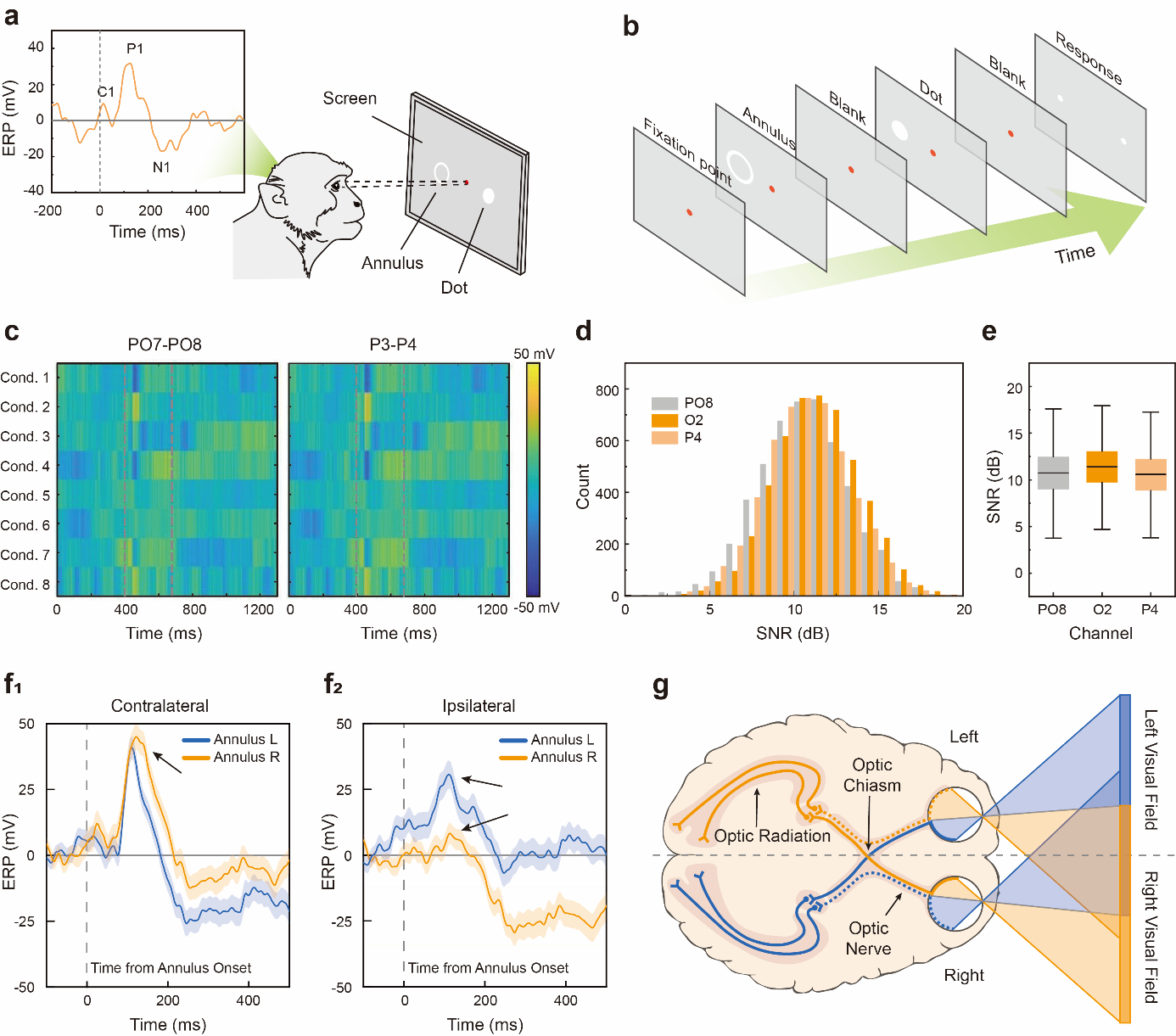 图3. 猴子视觉注意研究中的事件相关电位监测。a)用于研究猴子大脑注意过程半球偏侧化的视觉注意任务实验设计。b)视觉注意任务的实验流程。c-e)两组相邻通道(HAAT电极vs.商用电极)的事件相关电位热图、信噪比的统计直方图(d)和箱线图(e)对比。f)在左侧圆环和右侧圆环条件下的对侧(f1)与同侧(f2)事件相关电位。g)大脑对视觉信息的对侧加工示意图。