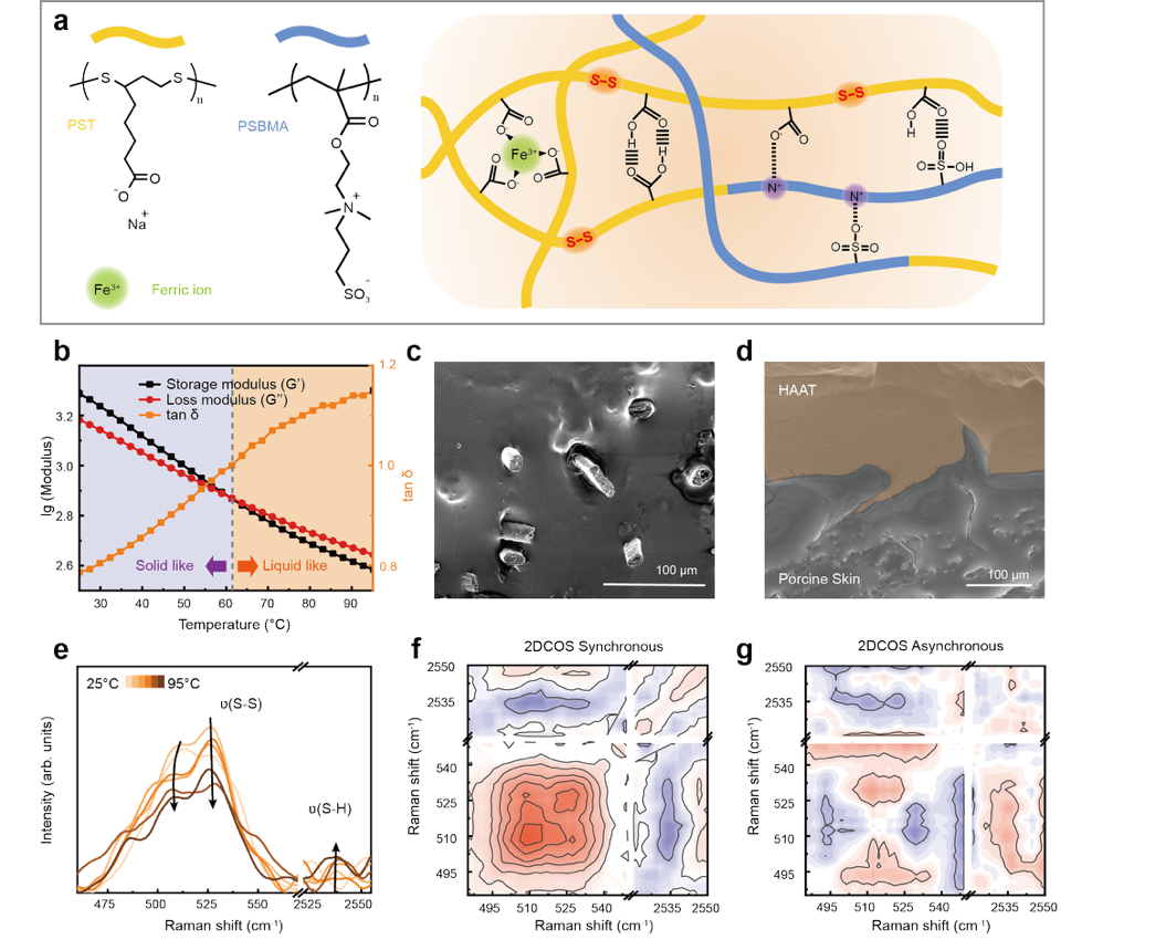 图2. HAAT的化学结构与动态分析。a)poly(ST-co-SBMA)的化学结构及链间相互作用。b)变温流变分析。c, d)SEM图显示HAAT穿透毛发形成共形界面。e-g)拉曼光谱的二维相关光谱解析不同键合作用随温度变化的解离顺序。