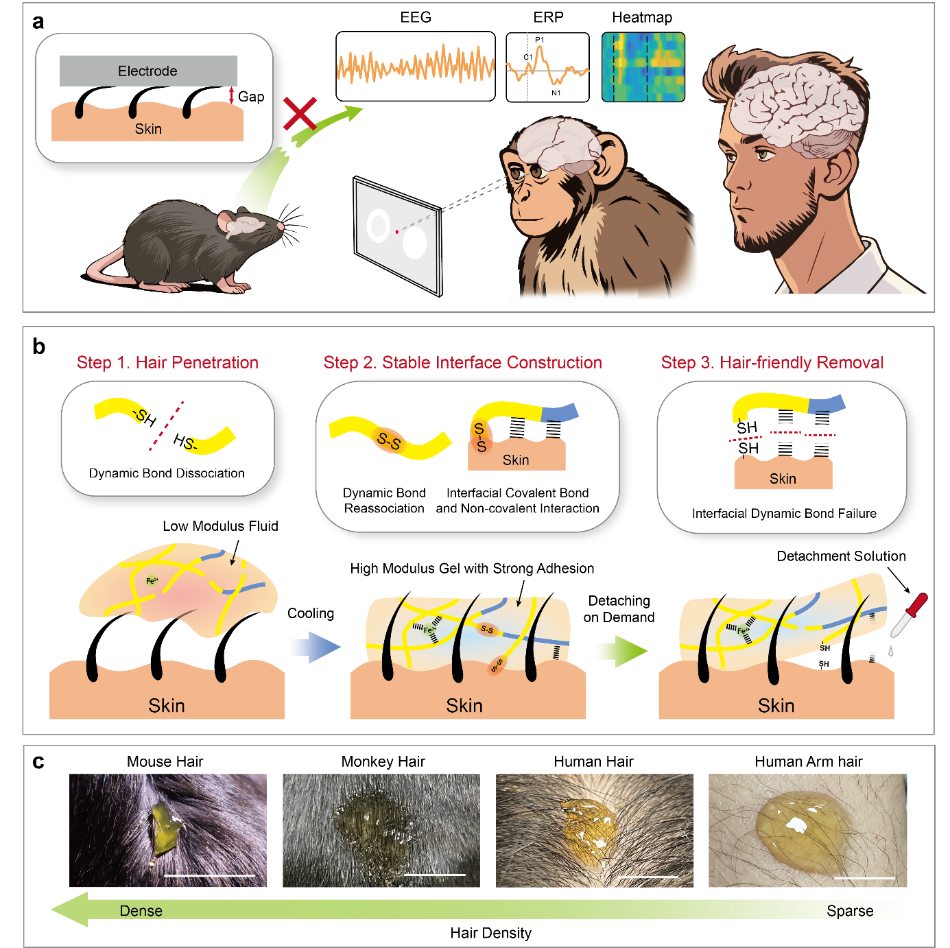 图1. 毛发适应与粘附可调的生物电子界面材料(HAAT)的设计。a)用于动物认知研究的HAAT示意图。b)HAAT的毛发适应性与粘附可调的工作机制:1)动态键的断裂使材料能够穿透毛发;2)动态键的重组与界面共价键的形成实现强粘附;3)界面动态相互作用的失效实现无损去除。c)HAAT穿透不同密度毛发的照片,包括猴子、小鼠的浓密毛发以及手部稀疏毛发。