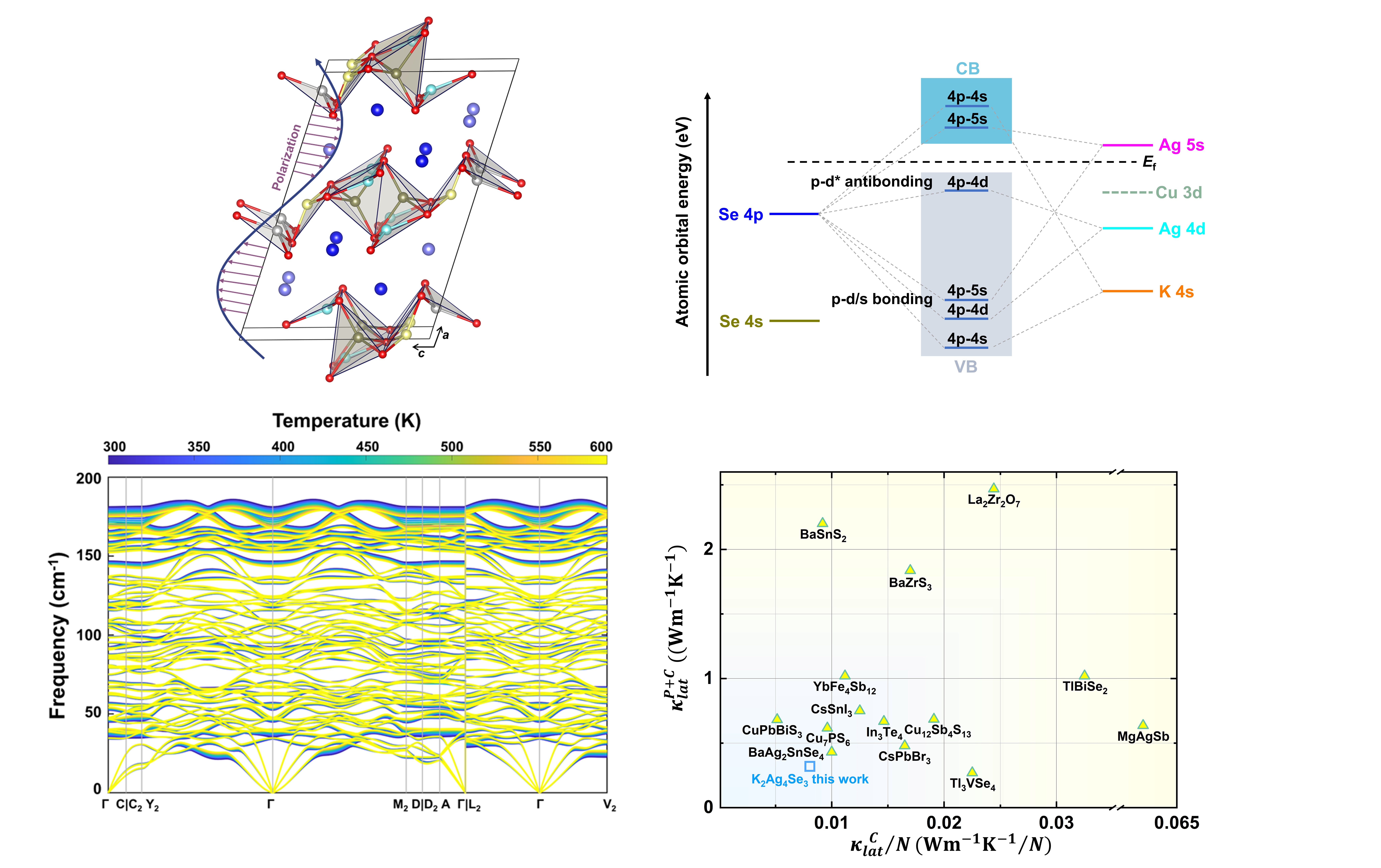 近期,北京师范大学珠海先进材料研究中心、化学学院吴立明、陈玲教授课题组成功合成一例K2Ag4Se3伪层状低热导率化合物, 其室温热导率仅为0.32 Wm-1K-1,是研究本征声子非谐作用对晶格热传导影响的良好体系。通过晶体结构、晶格动力学、电子结构以及声子输运特性的全面研究,他们发现价带顶附近的p-d反键态及p−d角动量的有效混合,促使了空穴载流子的离域化。这种离域化使得Ag原子各向异性热振动引起的电子云扰动,在长距离上得到传递,从而增强了不同Se原子振动之间的相关性。这种Se−Se长程相互作用调控了中频到高频区间的晶格层间剪切行为;同时随着温度升高,这种作用促进了三阶非谐作用和四阶非谐作用之间的竞争机制,导致全频谱声子的聚束。在低频区间内,这些长程相关性进一步使得Se原子以Se簇的形式,发生集体振动,从而抑制了声子的带内和带间传输。因此,由于非谐散射相空间巨大、声子寿命极短、声子群速度低,K2Ag4Se3呈现了类玻璃态低热导率特性。研究表明,该材料结构中的AgSe3单元不仅作用于类粒子态声子,还作用于波动态声子;并通过介导电荷极化的长程传递,实现晶格热导率的降低。这些认识将有助于推动晶体材料定制热性能的设计与开发。