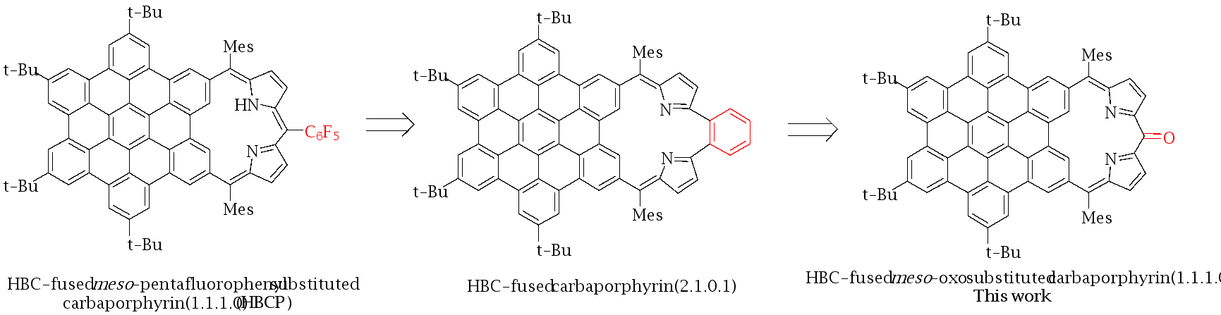 四价Ni配合物由于很高的反应活性,近年来受到广泛关注,然而合成稳定的四价Ni配合物挑战性很大,而且目前据我们所知还没有卟啉类配体的四价Ni配合物的报道。我们课题组希望通过对吡咯单元的改造来调节纳米石墨烯-碳杂卟啉杂化体系对金属离子的配位能力,从而实现对高价Ni离子的配位。如图1所示,meso-五氟苯基取代的第一代纳米石墨烯配体为负三价空腔,适配第11族金属阳离子,但是这类配体螯合第10族金属离子比较困难。我们进一步引入邻苯二吡咯单元,得到了具有负二价空腔的第二代纳米石墨烯配体,但是该配体能够螯合Pd2+(Org. Lett. 2025, 27, 9939−9944),但是Ni配合物的合成不成功。最近我们将二吡咯烷酮引入到纳米石墨烯体系,不仅成功实现了Ni2+配合物的合成,而且进一步氧化得到一个形式Ni4+配合物。该四价Ni纳米石墨烯配合物在固态条件下具有良好的稳定性,其结构也通过单晶X-射线衍射进行了表征。