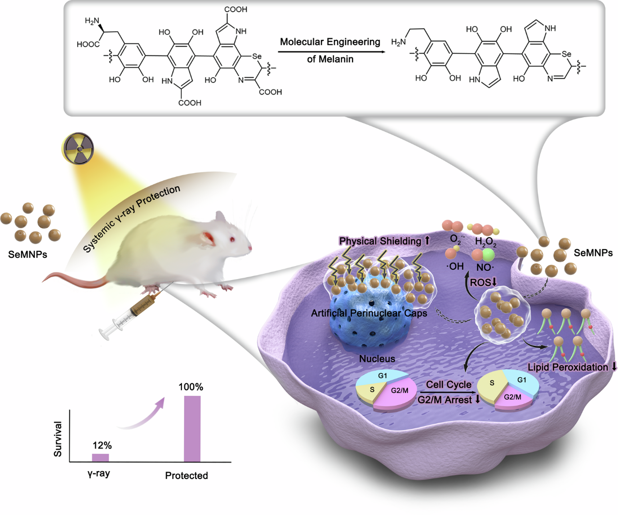 针对上述需求,北京师范大学曹玮教授与清华大学许华平教授合作,通过分子工程策略对黑色素进行结构优化,成功开发出一系列无金属的含硒黑色素纳米材料。该类材料具有更高的共轭结构、增强的物理屏蔽性能以及优异的抗氧化能力。在动物实验中,经工程化改造的黑色素材料显著提高了小鼠在6 Gy γ射线全身照射后的存活率,从仅12%提升至100%,展现出卓越的活体内辐射防护潜力。该研究通过分子工程成功构建出具有高共轭度和优异生物相容性的含硒黑色素材料,不仅显著提升了对γ射线的防护效能,还系统揭示了其通过物理屏蔽、抗氧化调控和基因表达调节等多重机制发挥辐射保护作用。这项工作为设计新型无金属、轻量化辐射防护材料提供了重要思路,其分子调控策略也有望推广至其他生物大分子材料的功能化设计。