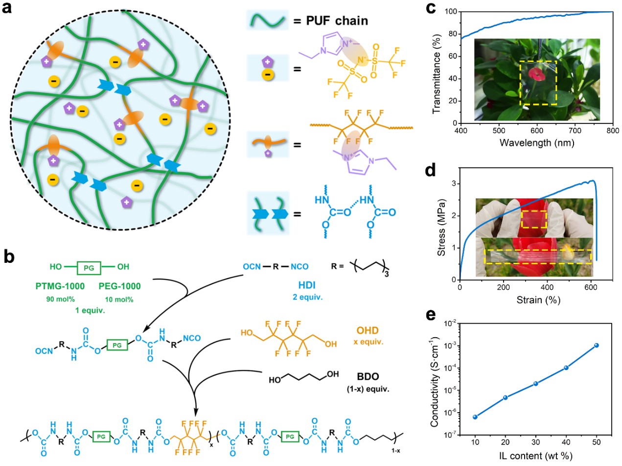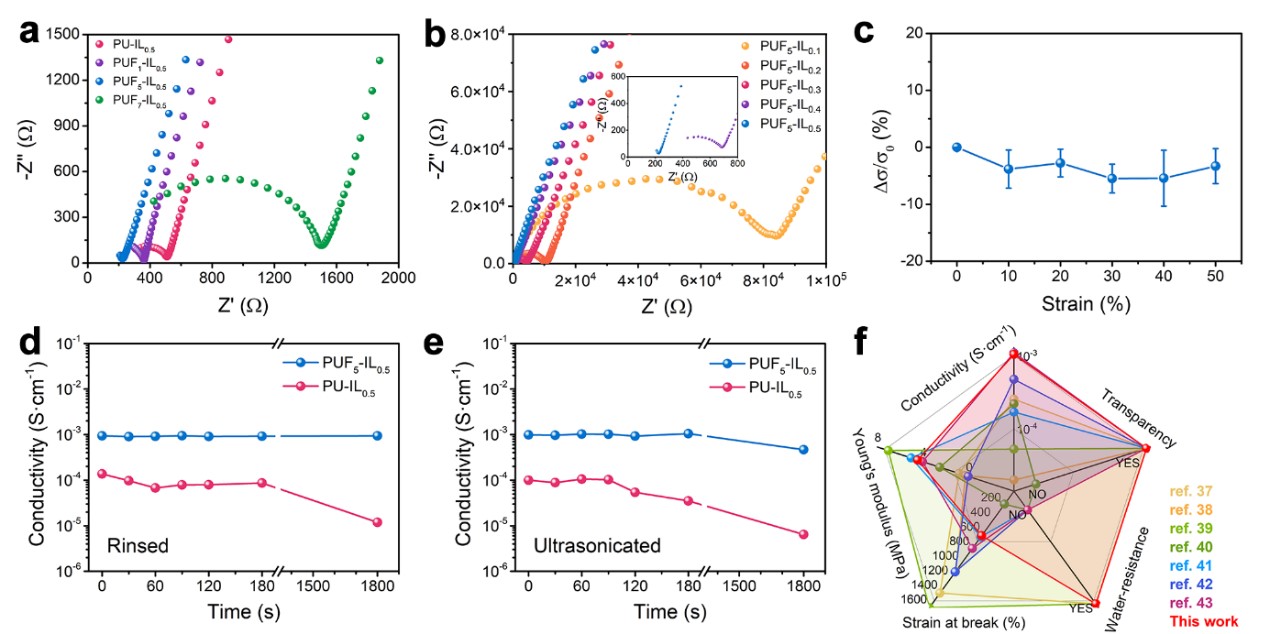 近日,北京师范大学化学学院刘楠教授团队设计制备出一种皮肤状、光学伪装和高电导率的离子皮肤,用于全天监测表皮电生理信号。该离子皮肤基于一种与离子液体共混的氟化聚氨酯弹性体(PUF-IL),其中将2,2,3,3,4,4,5,5-octafluoro-1,6-己二醇(OHD)作为含氟链段引入PU骨架,并采用富氟的[EMIM]+[TFSI]-作为离子液体。氟原子的电负性会对阳离子产生强大的静电力。源自PU基质中OHD段对[EMIM]+离子的紧密拖曳导致了强的氟-阳离子相互作用(图1),从而产生更多的自由离子,离子电导率也得到提升(约10-3 S cm-1)。此外,由于这种强的氟-阳离子相互作用,材料中的离子在水环境下不易发生离子交换或泄漏,使得其在水中的离子电导率相对稳定,甚至能承受超声处理(图2)。因此,PUF-IL离子皮肤可以在大气和有水环境中准确测量各种细微的电生理信号,进而应用于可穿戴医疗保健,进行全天表皮生物电位监测(图3)。