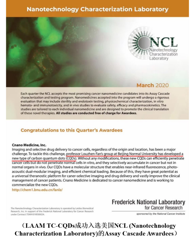 该研究工作近期发表在《Nature Biomedical Engineering》杂志上 (Targeted tumour theranostics in mice via carbon quantum dots structurally mimicking large amino acids)。北京师范大学化学学院为第一完成单位。化学学院博士生李淑花,宿雯和吴浩为论文的共同第一作者,范楼珍教授、朱嘉副教授和耶鲁大学周江兵教授为共同通讯作者。相关技术成果已经申请了国际发明专利(PCT/CN2019/115263)。LAAM TC-CQDs成功入选美国NCL (Nanotechnology Characterization Laboratory)的Assay Cascade Awardees。NCL将为这一项目提供免费临床前安全评价、药效和药物代谢等实验。据悉,这是来自中国大陆的首例入选项目。该研究得到国家自然科学基金,理论及计算光化学教育部重点实验室和放射性药物教育部重点实验室资助。