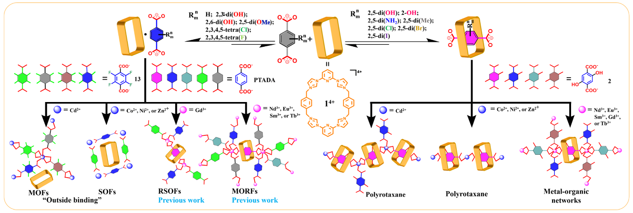 在本研究中,以对苯二甲酸二价阴离子(p-phthalic acid dianions; PTADAs)为母体,研究了十二种具有不同取代基的PTADA衍生物和柔性咪唑盐阳离子大环化合物环[2](2,6-二(1H-咪唑基)吡啶[2](1,4-二亚甲基苯) (14+,抗衡阴离子为PF6−) 之间的主客体相互作用。通过溶液相 (DMSO-d6 )和单晶衍射实验结果表明当取代基为2-OH, 2,5-di(OH), 2,5-di(NH2), 2,5-di(Me), 2,5-di(Cl), 2,5-di(Br), 或 2,5-di(I) 时,促进主客体形成假轮烷结构;而取代基为2,3-di(OH), 2,6-di(OH), 2,5-di(OMe), 2,3,5,6-tetra(Cl), 或2,3,5,6-tetra(F) 时,只得到主客体外部结合结构。进一步研究表明当自组装组分包含其他金属阳离子 (M) 时,通过选择PTADA衍生物与14+的不同结合模式可进一步调节超分子自组装结构。通过控制PTADA衍生物和金属阳离子 (M = Co2+, Ni2+, Zn2+, Cd2+, Gd3+, Nd3+, Eu3+, Sm3+, Tb3+) 构建一系列高阶自组装结构,其中包括一维聚轮烷、轮烷超分子有机框架结构 (RSOFs) 或者二维金属有机轮烷骨框架结构 (MORFs)。取代基的存在和性质决定了在使用给定阳离子时获得哪种特定的更高阶自组装结构。在取代基为2,5-di(OH), 2,5-di(Cl), 或2,5-di(Br) 的PTADA衍生物以及Eu3+存在情况下,与14+三组分自组装可以得到具有不同结构和荧光发射特性的MORFs。本工作表明客体取代基的细微变化可用于长程调控互锁结构自组装体系的结构和性能。