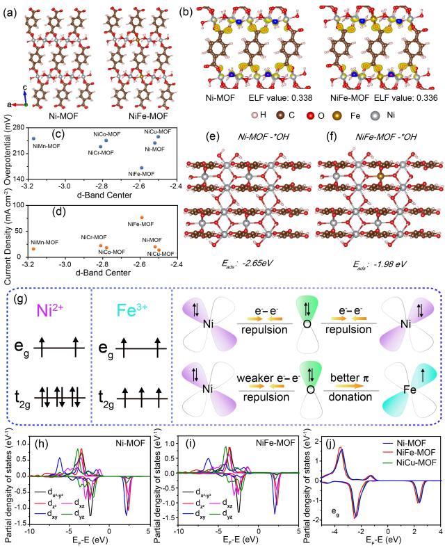 近日,孙根班教授团队通过合理设计将电负性不同的过渡金属(Cr、Mn、Fe、Co和Cu)引入Ni-MOF中,探究了Ni位点的电子结构与OER电催化活性之间的关系。密度泛函理论结果揭晓二维镍基双金属有机框架(NiM-MOF,M= Cr、Mn、Fe、Co和Cu)的电催化活性与d带中心具有强烈的火山关系,这是由引入的电负性位点调节Ni位点的电子结构决定的。其中,Fe的引入有效调节了具有高活性Ni位点的电子结构和自旋态密度,平衡了中间体的吸附/解吸,最小化了OER的能垒(图1),从而提高了电催化剂的本征活性。得益于电负性位点和高密度自旋态的协同效应,如图2所示,NiFe-MOF在10 mA cm-2下表现出172 mV超低过电位,显著低于其他二维镍基金属有机框架(Ni-MOF和NiM-MOF)和商用RuO2,是当前OER粉体催化剂最好性能之一。这个工作从电子水平角度提供了电负性位点和自旋态对OER性能影响的基本见解,有利于进一步开发高性能新型电催化剂。