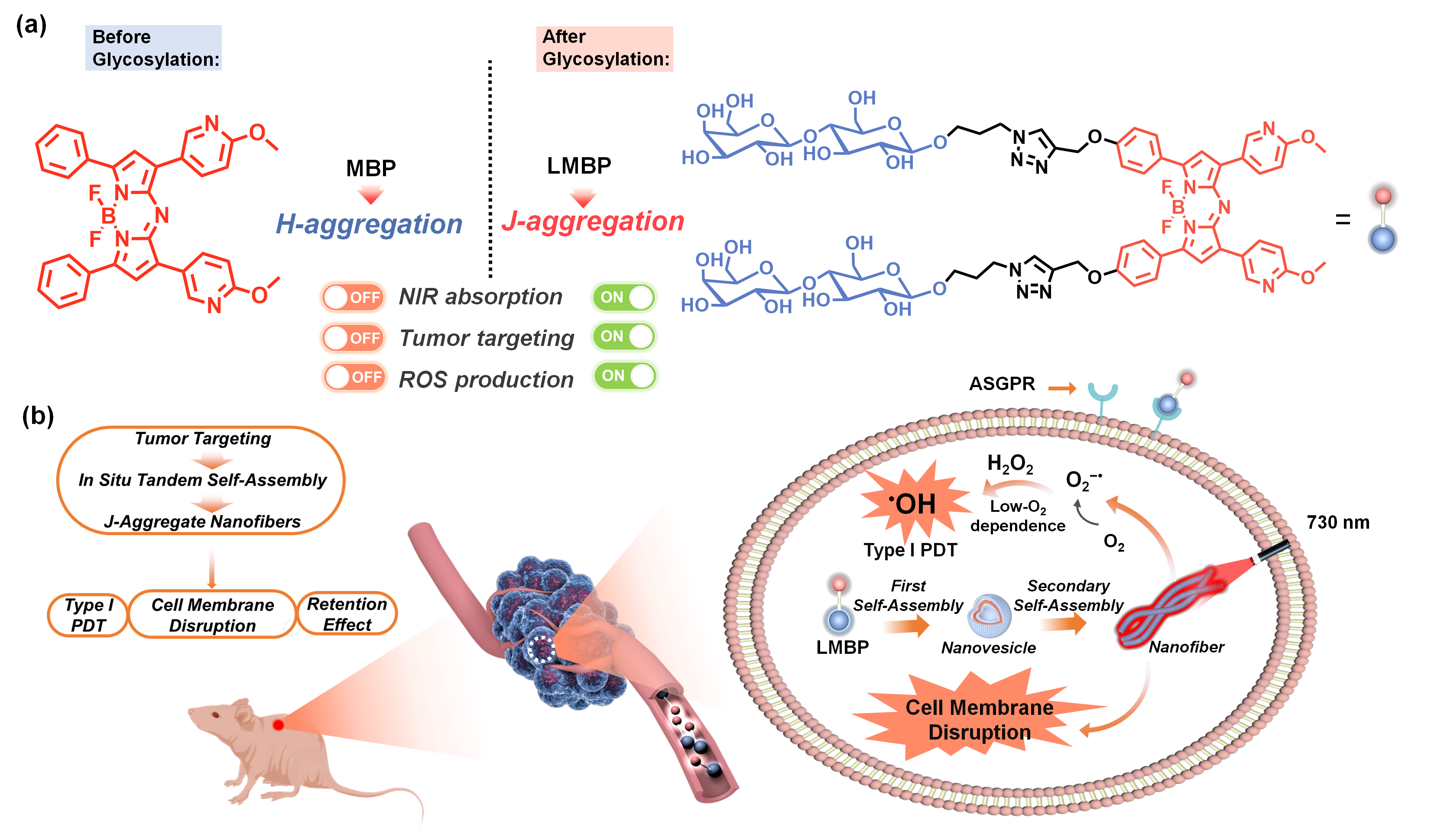 糖基修饰的Aza-BODIPY光敏剂研究:原位自组装为J-聚集纳米纤维、细胞膜破坏与I型光动力治疗