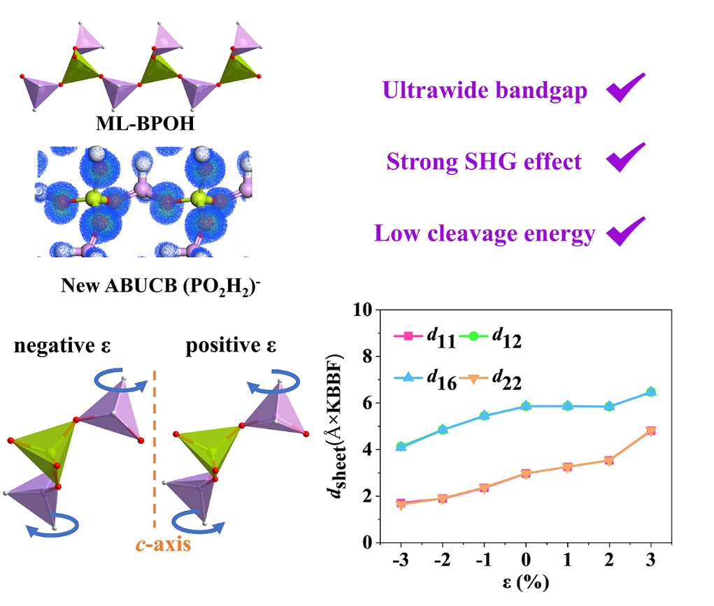 近期,陈玲老师和中科院理化所林哲帅研究团队共同努力,从理论上预测了一种新型的单层BeP2O4H4(ML-BPOH)二维材料。该材料将(PO2H2)-四面体作为构筑单元,而(PO2H2)-则是一种新的包含多种化学键的各向异性构筑单元(ABUCB,由陈玲老师等首次提出,Chem. Soc. Rev. 2023, 52, 8699–8720.)。密度泛函理论研究揭示了ML-BPOH具有超宽的深紫外带隙(7.84 eV),为已知二维倍频材料的最大值之一。ML-BPOH的面内倍频性能强,有效厚度下的