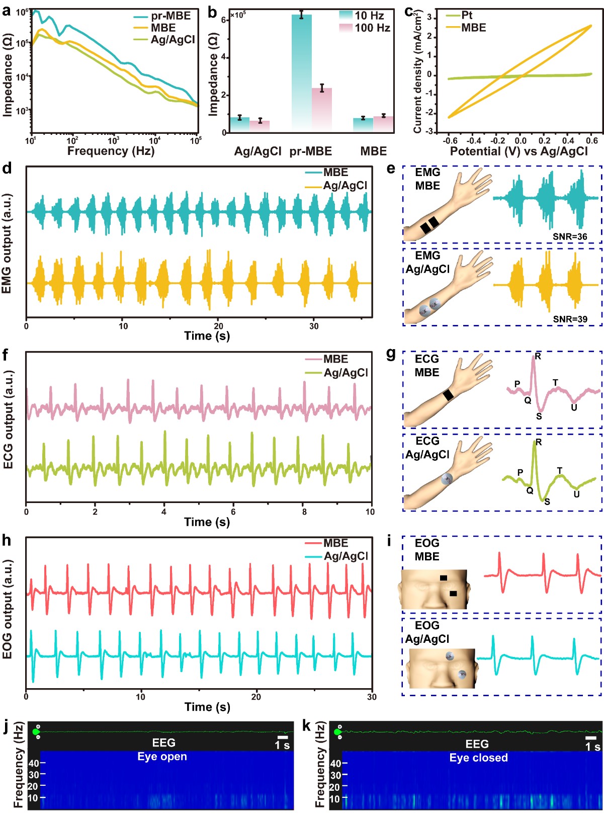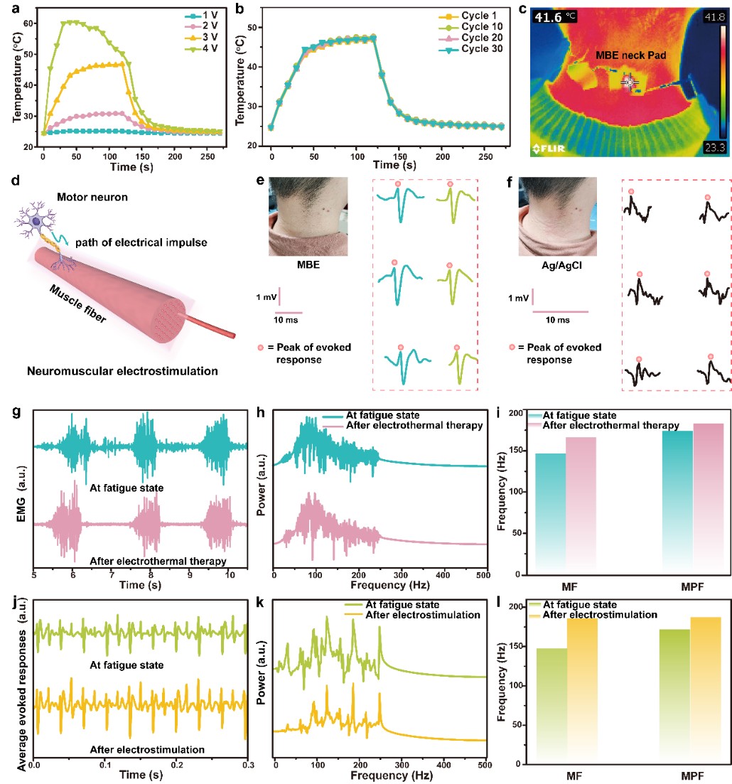 近日,北京师范大学化学学院刘楠教授团队开发出一种一体化、生物衍生、透气且汗液稳定的MXene表皮电极用于肌肉诊疗。该工作是以紫叶狼尾草为原料,通过化学刻蚀制备得到柔性多孔纤维素骨架。 然后负载MXene导电层,并在人工汗液中浸泡交联,得到多孔、高导电的MXene电极(图1)。由于草本植物的结构排列和MXene在汗液中的离子交联,该电极具有高透气性和各种环境低且稳定的电极-皮肤界面阻抗。因此,该电极可以可靠地采集表皮电生理信号,如肌电图(EMG)、心电图(ECG)、眼电图(EOG)和脑电图(EEG)(图2)。此外,由于其良好的焦耳加热能力,电极表现出低电压热疗效果。将电刺激、电热治疗和电生理传感器集成为一个系统,可实现一体化诊断和治疗,为肌肉疲劳的日常穿戴式诊疗提供了一种实用的方式(图3)。它还可以通过人机交互进行肌肉康复训练和假肢控制。