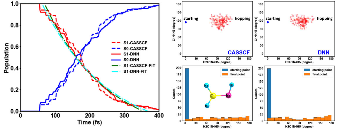 最近,化学学院崔刚龙老师利用基于神经网络的深度学习方法首次精确重现了多原子分子体系基态和激发态的势能面及其交叉区域的拓扑结构,并利用所得到的多态势能面进行了非绝热动力学模拟。基于深度学习的非绝热动力学模拟在降低计算量的同时,给出了和从头算级别非绝热动力学模拟近乎一样的动力学结果。结果表明深度学习方法可以足够准确地重复复杂的多态势能面的拓扑结构,可用于研究复杂的光物理和光化学反应动力学的研究。