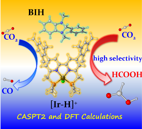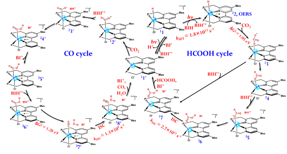 将过量的二氧化碳(CO2)转化为具有高附加值的化学原料是解决全球能源危机、实现碳中和的最佳方案之一。尽管自然界可以通过光合作用将CO2高效地转化为有机物,但是由于CO2具有热力学稳定性和化学惰性,人工捕获和还原CO2仍然是一项非常具有挑战性的工作。近期,北京师范大学崔刚龙教授团队采用了高精度的多参考CASPT2方法探索了铱(Ir)配合物催化剂[Ir(III)H]+的激发态性质和光物理过程,采用高效的DFT方法系统地研究了其后续生成HCOOH和CO的整个催化反应路径,同时还计算了辐射、无辐射和电子转移过程的相应速率,最终系统研究了Mes-IrPCY2光催化二氧化碳还原的微观反应机理,揭示了HCOOH高选择性的物理起源。