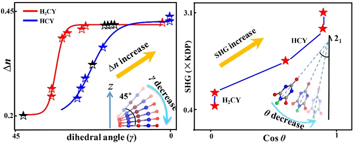 近期,北师大吴立明、陈玲课题组以π-共轭的[C3N3O3]3-(CY)离子为构筑单元,通过结构设计-探索合成—晶体结构和理论计算系统揭示氰尿酸盐家族大的极化光学各向异性和其结构关系,首次提出阴离子基团(CY环)的共面性是产生大双折射的根本原因,其关系可由Boltzmann函数(二面角γ-Δn)精确表达,调控共轭CY环的共面性,可计算或预测氰尿酸盐的双折射,在这一策略的指导下,他们设计并合成了CY环完美共面性下(γ=0°)的氰尿酸盐II, Rb2HC3N3O3,其双折射达到了氰尿酸盐家族中最大值(Δn = 0.4)。此外,该工作首次从阴离子基团的微观超极化率与晶体宏观对称性、宏观非线性响应角度出发,提出氰尿酸盐的SHG强度与阴离子基团最大超极化率向量(bmax)和21极轴的夹角(θ)呈负相关,设计合成的化合物III (LiRbHC3N3O3·2H2O), IV (NaRb0.86Cs0.14HC3N3O3·2H2O), V (NaRb3(H2C3N3O3)4·3H2O), 其SHG分别呈现2.7, 3和0.4 KDP (θ分别是29.99°,26.61°和90°),进一步用实验及第一性原理证明了SHG-θ关系的正确性,其中IV的d33达6.69 pm/V,为目前氰尿酸盐家族中最大值,并且指出如果能实现结构中CY环的bmax向量平行极轴排列将有望实现氰尿酸盐家族dij最大值。该研究γ-Δn和θ-SHG结构-性能策略不仅为新的高性能的氰尿酸盐的发现开辟了道路,也为其他π-共轭体系的设计合成通过了重要参考。该工作以“How to maximize birefringence and nonlinearity of π-conjugated cyanurates”为题被美国化学会志接收发表(J. Am. Chem. Soc.,2019,DOI: 10.1021/jacs.9b08851),北京师范大学为唯一单位。该研究得到国家自然科学基金、北师大高层次引进人才基金、化学学院、北京市重点实验室等资金的资助。