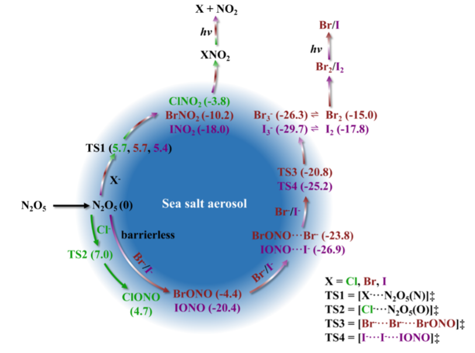 卤素(氯、溴和碘)在大气中普遍存在,并对大气的化学成分产生显著影响,进而影响污染物的命运并可能对气候产生影响。非均相化学已成为卤素化学中的一个关键过程。N2O5激活卤素的过程尤其重要,这与NOx的来源、臭氧浓度、NO3的均相反应性以及含卤化物气溶胶颗粒的可获得性有关。例如,测量结果显示,氯化物对(NO2+)(NO3-)的攻击效率比水攻击高出约500倍,导致ClNO2的大量产生。与此形成鲜明对比的是,迄今为止还没有关于BrNO2或INO2的原位观测报告。不幸的是,尽管其重要性,但由于气溶胶化学环境的复杂性,N2O5-X-化学反应的详细机制仍然缺乏。