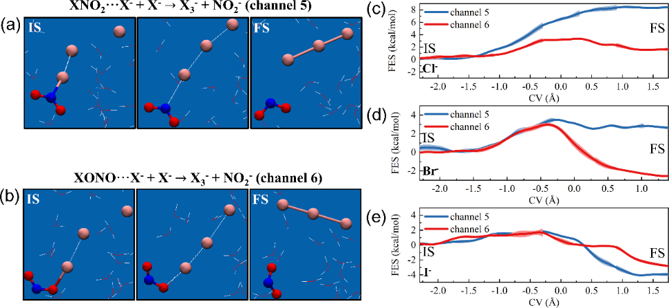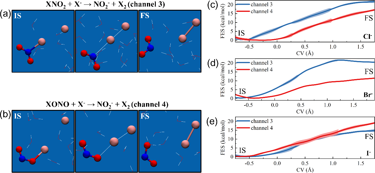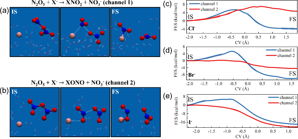 图4. XNO2 (a) 和XONO (b) 与X-在水气界面反应生成 X2 的代表性快照和自由能剖面图 (c, d, e)。