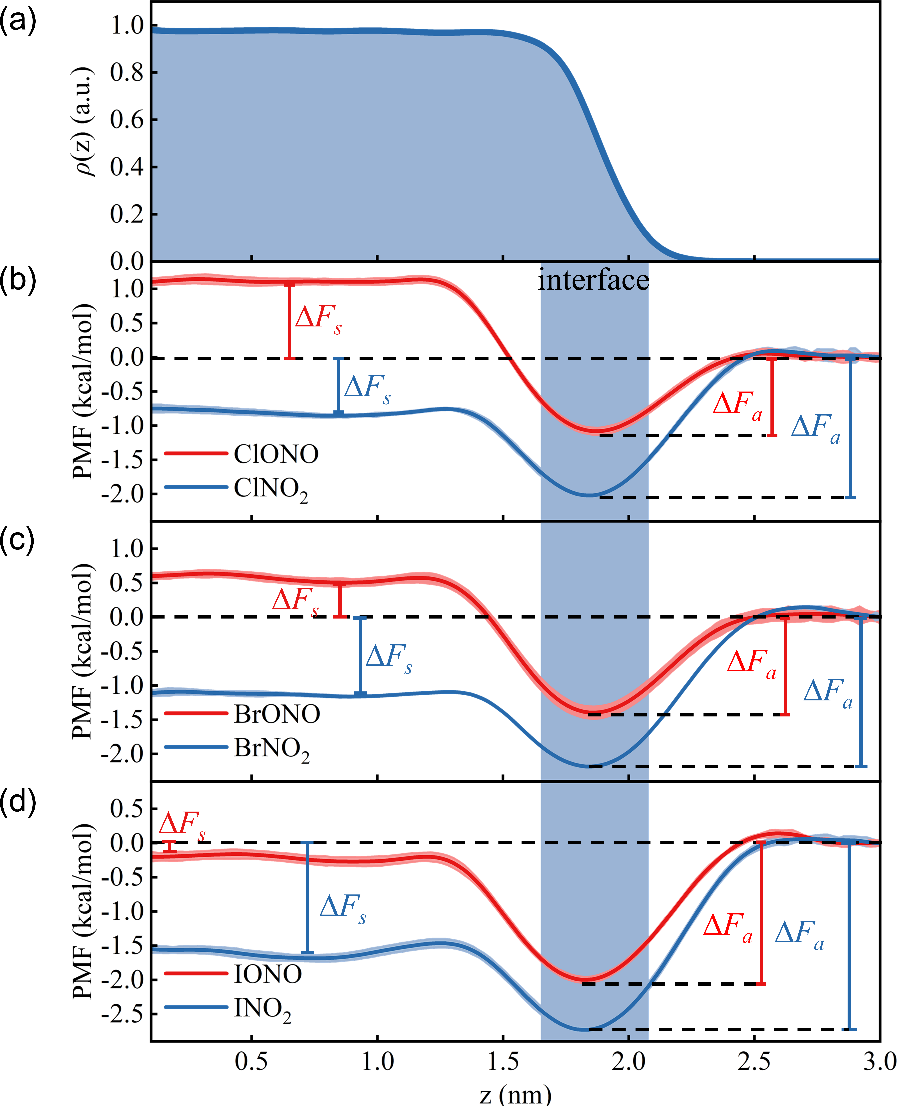图3. ClONO/ClNO2 (b) , BrONO/BrNO2 (c) , IONO/INO2 (d) 从体相穿过水气界面到气相的自由能剖面图。