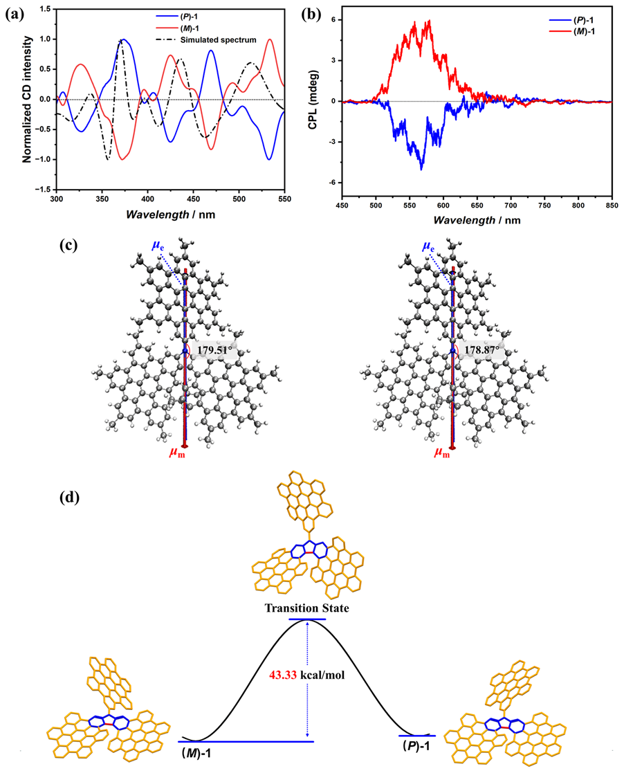 此外,化合物1展现了卓越的化学和手性双重稳定性。在化学稳定性测试中,氮杂化合物通常在酸性条件下因质子化而导致显著的光谱变化,但1即使在128倍摩尔当量的三氟乙酸作用下,其紫外和CD光谱均未显示显著变化。同时,1与强氧化剂(NOSbF₆)或强还原剂(钴烯)反应后,光谱也未发生明显变化,进一步证明其化学稳定性。手性稳定性测试表明,(P)-1在120°C条件下加热12小时未发生手性反转。理论计算支持这一结果,显示化合物1的翻转势垒高达43.33 kcal/mol,进一步说明其手性结构的高度稳定性。
