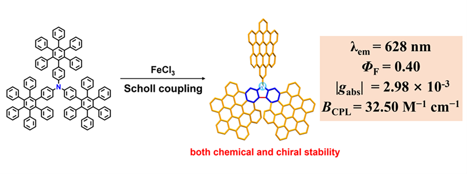 该分子通过仅三步反应成功合成,并以总产率12.4%获得最终产物。值得注意的是,在合成的最后一步中,利用FeCl₃介导的Scholl偶联反应形成了19个新的碳-碳键,其中包括围绕核心氮原子构建咔唑单元的关键碳-碳键。单键成键的平均产率高达94%,这充分体现了该方法的高效性。