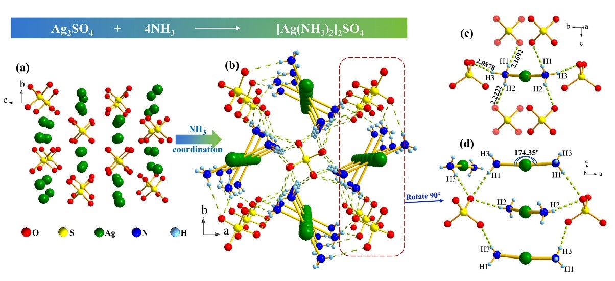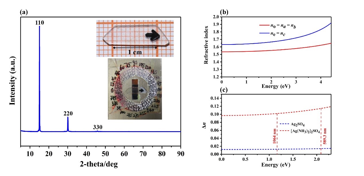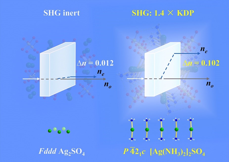 近期,化学学院吴立明、陈玲教授课题组提出了一种阳离子的配位策略,实现了材料的非线性和线性光学性能提升。在该工作中,他们通过引入中性配体NH3对 Ag+ 进行配位,驱动了Ag2SO4结构从中心对称Fddd空间群向非中心对称四方P421c结构的转变,使得该体系从非线性光学惰性到非线性光学活性的转变。同时与Ag2SO4相比较(∆ncal = 0.012 @ 1064 nm),[Ag(NH3)2]2SO4晶体呈现出显著的双折射率提升(∆nexp = 0.08 @589.3 nm,计算值∆ncal. = 0.102 @ 1064 nm)。理论研究证明,[Ag(NH3)2]2SO4晶体的大双折射率特性主要来源于配位后的特殊的阳离子次结构。由于[Ag(NH3)2]+的两个配体NH3沿c轴方向形成一个N-Ag-N夹角,这使得阳离子次结构沿c轴产生了一个0.12 D的偶极,而化合物在ab平面上的偶极为零。由于该偶极可与入射光振荡电磁波产生相互作用,使得电磁波的运动在c轴方向被迟滞,从而导致该材料具有大双折射率的光学各向异性。另外,[Ag(NH3)2]2SO4表现出较大的相位匹配的SHG强度(1.4 × KDP @1064 nm),DFT理论计算表明,[Ag(NH3)2]2SO4的SHG响应由阳离子[Ag(NH3)2]+和阴离子SO42-共同贡献。上述研究结果表明在该材料中阳离子对NLO相关性能具有主要的贡献,因此该报道提出的阳离子的配位结构修饰策略,将为非线性光学材料的设计和性能提升提供新的思路。