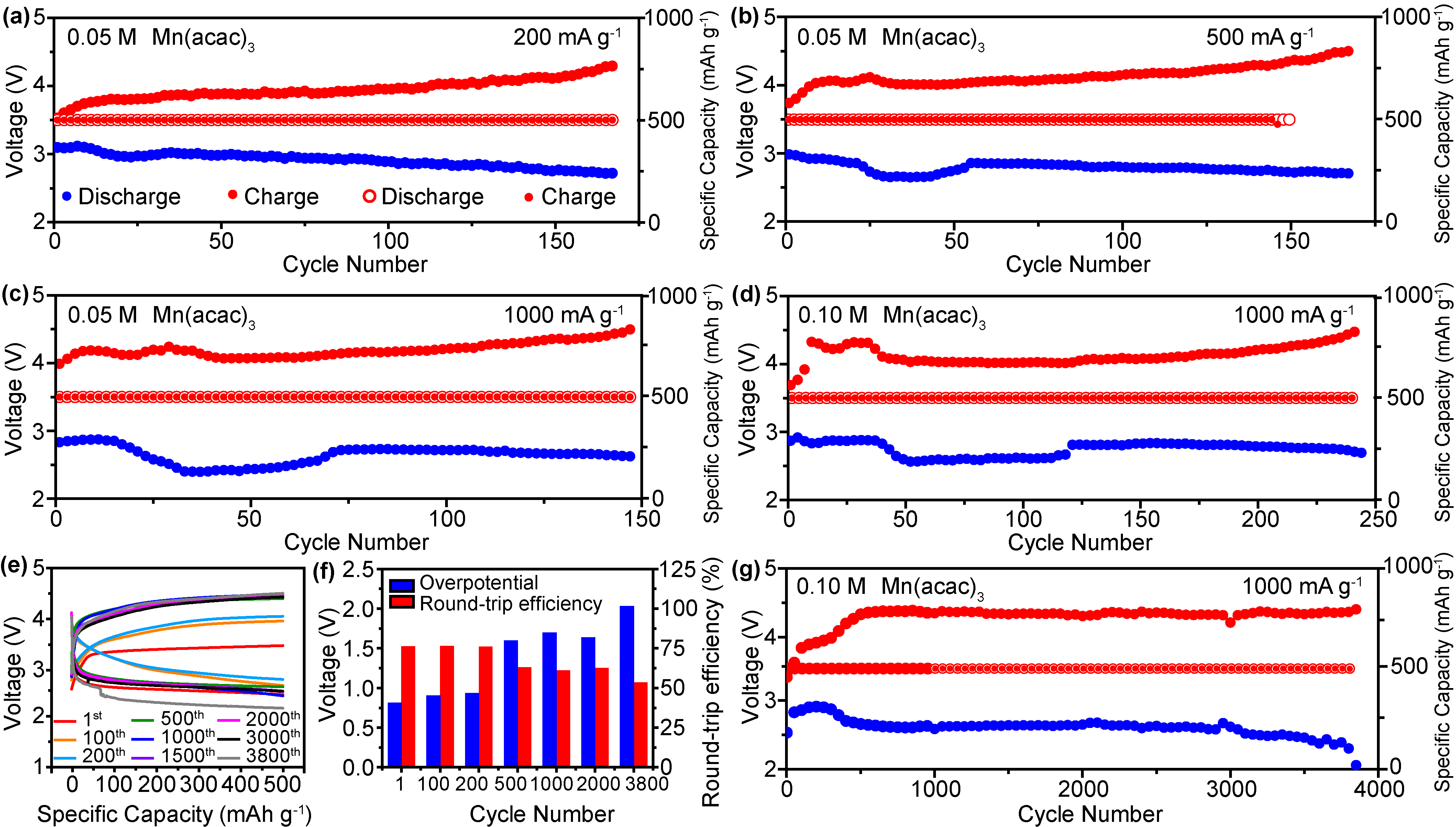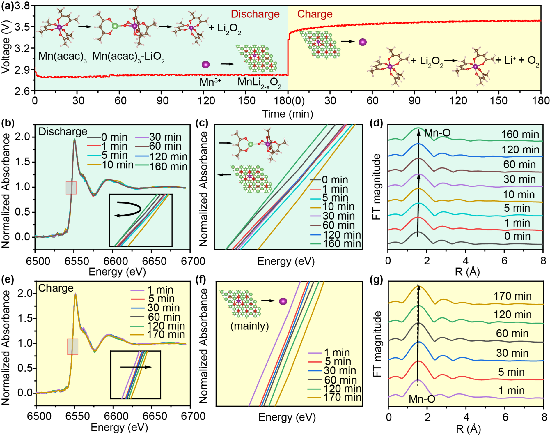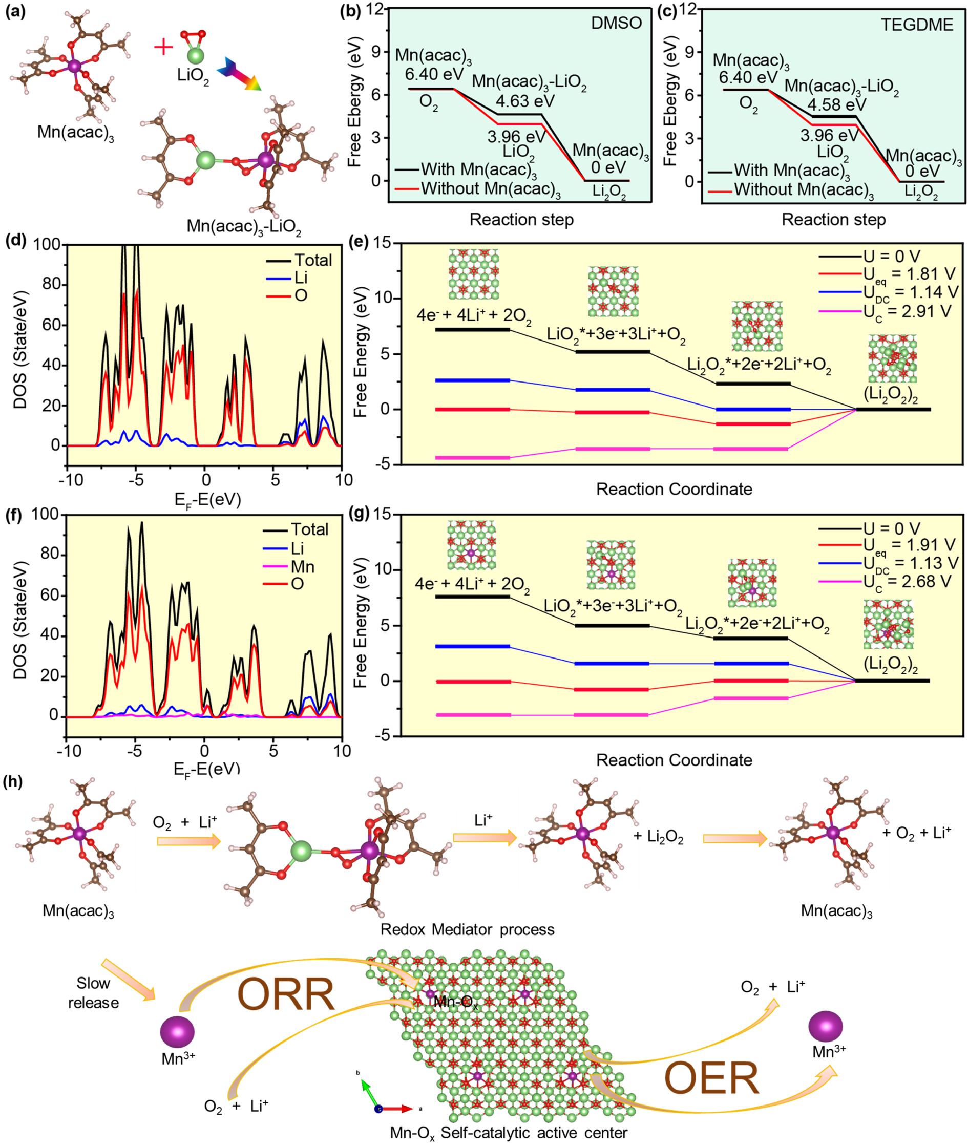 基于此,北京师范大学化学学院孙根班教授团队提出了一种自催化与氧化还原媒介协同耦合的超长循环寿命的锂空气电池体系。采用具有弱电解质性质的有机金属盐作为双功能添加剂,耦合自催化体系与中间产物反应路径的优化,使乙酰丙酮盐在Li-O2电池中表现出作为过渡金属阳离子和氧化还原介质的双重特性。如图1所示,在Mn3+和Mn(acac)3分子共存的情况下,金属离子可以通过原位电化学植入法,经过还原后,掺杂进入Li2O2,形成放电产物Mn-Li2-xO2,从而改变其绝缘性能。此外,有机金属盐作为液相氧化还原介质(RMs),有效捕获和稳定中间相LiO2,形成复杂结构Mn(acac)3-LiO2,在充电过程中不仅能够稳定中间体LiO2,还能促进中间体进一步转化生成Li2O2,并增强分解反应,这一点通过原位同步辐射和紫外可见光谱得到进一步证实。含有Mn(acac)3的Li-O2电池显示出0.43 V的超低过电位,并在1000 mA g-1下能够维持250次长循环。如图2所示,当结合反应环境优化策略,可在1000 mA g-1下实现3850次的长循环稳定性。通过理论计算模拟,提出了利用Mn(acac)3的Li-O2电池的ORR和OER机制。如图3所示,揭示了氧化还原介质的作用以及基于分子形式Mn(acac)3和电化学植入的活性Mn-Ox簇的自催化反应机制,进一步证实了自催化体系与氧化还原媒介协同耦合的机理,为设计先进的超长寿命锂氧气电池系统和提高其电池关键性能提供了新的见解。
