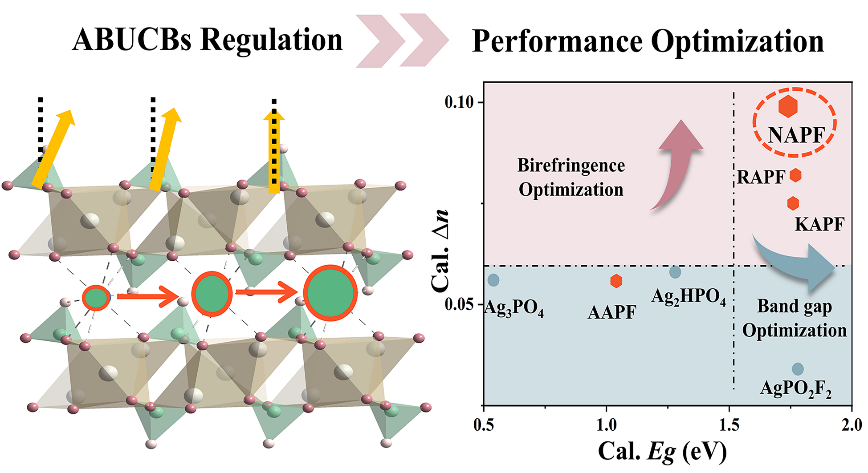 本研究利用路易斯酸性大小差异,调控离子交换,获得系列新型单氟磷酸盐材料A'[Ag3(PO3F)2] (A' = Ag+, K+, Rb+, NH4+)纯相多晶粉末和毫米级单晶体。通过第一性原理计算研究,揭示该类晶体的光学各向异性主要源于[PO3F]2-基团和畸变的[Ag(1)O4]7-四面体。这些关键基团极性方向与介电轴的偏离角度越小,产生的各向异性越大。尤为重要的是,在NH4[Ag3(PO3F)2]材料中,由于NH4+阳离子形成的氢键网络,进一步增大了结构各向异性,使该材料实现了氟磷酸盐体系双折射率最大值(Δnobv. = 0.101,Δncal. = 0.099 @546 nm)。该数值达到氟磷酸盐体系历史记录的约两倍(NaNH4PO3F·H2O:Δnobv. = 0.053 @589 nm);并比孤对电子效应进一步提升20%(SnPO3F:Δncal. = 0.082 @546 nm)。