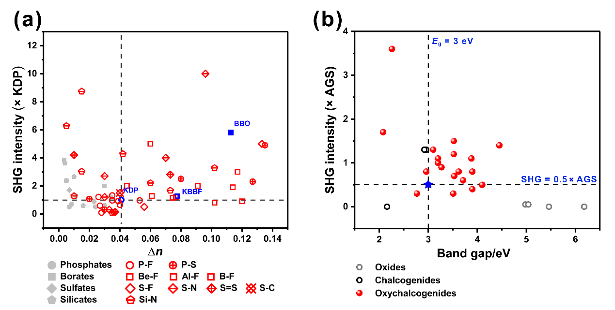 北京师范大学化学学院吴立明教授和陈玲教授课题组的前期研究工作表明:与PO4基元相比,引入氟离子后形成的PO3F基元的极化率各向异性和超极化率等均有大幅增强,并保持了较大的HUMO-LOMO能隙。利用这一基元,发现了一系列新颖高效的NLO化合物,双折射率大、倍频强度高等;如Na2PO3F和(NH4)2PO3F(Chem. Mater., 2018, 30, 5397–5403; Chem. Mater., 2018, 30, 7823–7830.)等。他们2019年的研究表明NaNH4PO3F·H2O化合物晶体结构中所有P-F键取向一致;该结构特征显著增强了化合物的宏观光学各向异性。其双折射率为迄今磷酸盐、单氟磷酸盐的最大值(J. Am. Chem. Soc., 2019, 141, 8093–8097。该文章在JACS杂志当年最高被引文章中列第三位)。这些开创性的工作启发了国际上系列高水平的研究:例如将氟或硫等杂原子,以及氨基(NH2)或甲基(CH3)等官能团结合到MO4单元中,发现了新颖的NLO活性基元,如PO4−xSx (x = 1,2,3)(Angew. Chem. Int. Ed., 2021, 60, 6386–6390.)、SO3F(Adv. Sci., 2021, 8, 2003594.)、和NH2SO3(Angew. Chem. Int. Ed., 2021, 60, 7621–7625.)等等。基于这些新颖的功能构筑单元,性能优异的NLO化合物不断涌现。