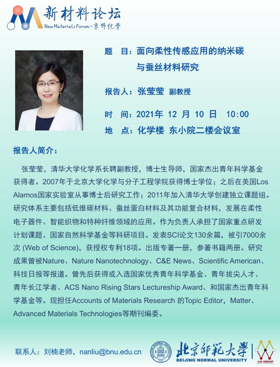 学术报告:清华大学,张莹莹副教授,面向柔性传感应用的纳米碳与蚕丝材料研究