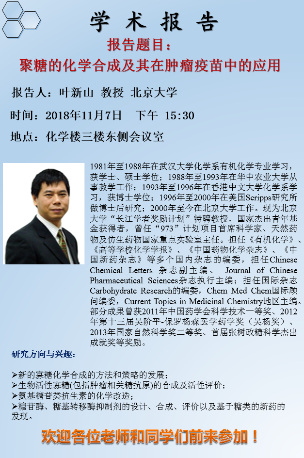 学术报告:北京大学,叶新山教授,聚糖的化学合成及其在肿瘤疫苗中的应用