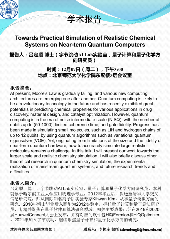 学术报告:字节跳动AI LAB实验室,吕定顺研究员,Towards Practical Simulation of Realistic Chemical Systems on Near-term Quantum Computers