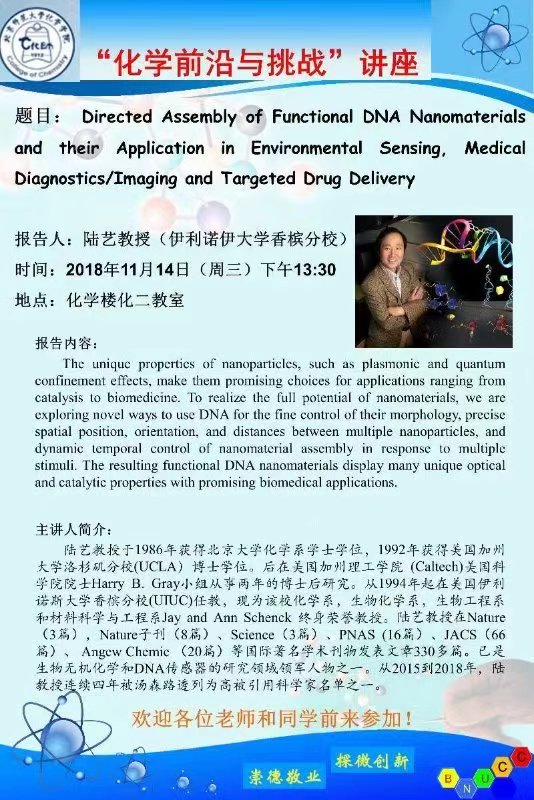 学术报告:伊利诺伊大学香槟分校,陆艺教授,Directed Assembly of Functional DNA Nanomaterials and their Application in Environmental Sensing,Medical Diagnostics/Imaging and Targeted Drug Delivery