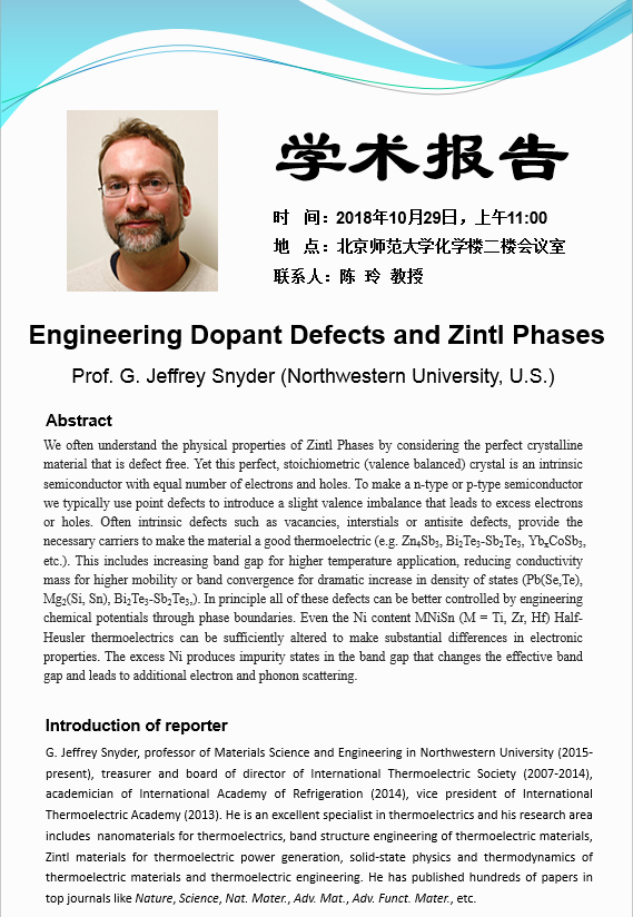 学术报告:Northwestern University, Prof.Jeffrey Snyder, Engineering Dopant Defects and Zintl Phases