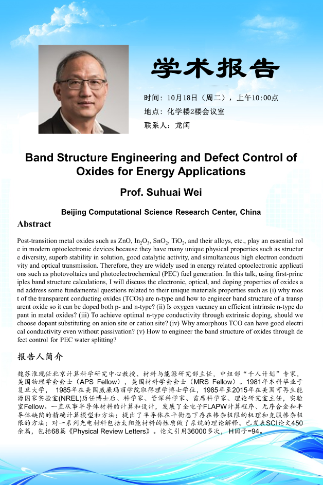 学术报告:北京计算科学中心魏苏淮教授,Band Structure Engineering and Defect Control of Oxides for Energy Applications