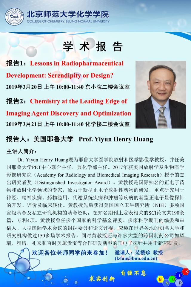 学术报告:美国耶鲁大学,Prof. Yiyun Henry Huang,Lessons in Radiopharmaceutical Development: Serendipity or Design?