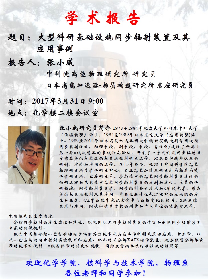 学术报告:中科院高能物理研究所, 张小威 研究员,大型科研基础设施同步辐射装置及其应用事例