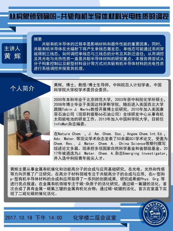 学术报告:中国科学院大学,黄辉教授,从构象锁到碲吩----共轭有机半导体材料光电性质的调控