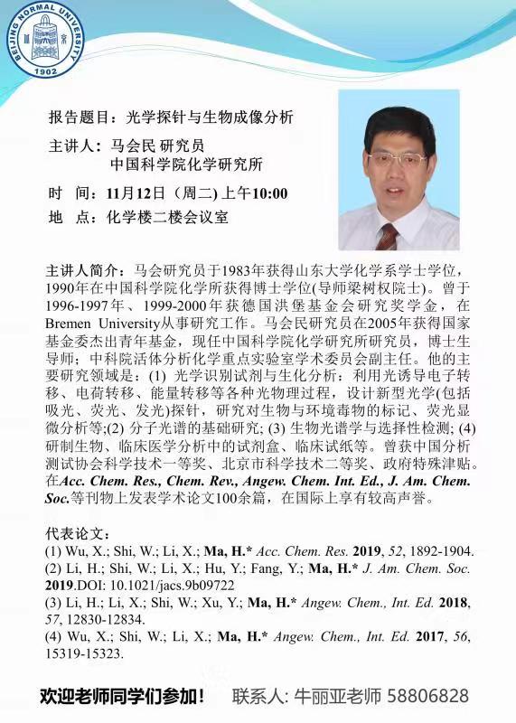 学术报告:中国科学院化学研究所,马会民研究员,光学探针与生物成像分析